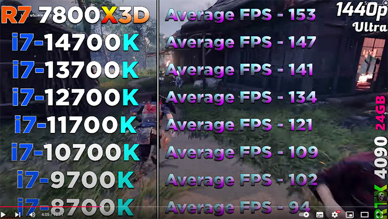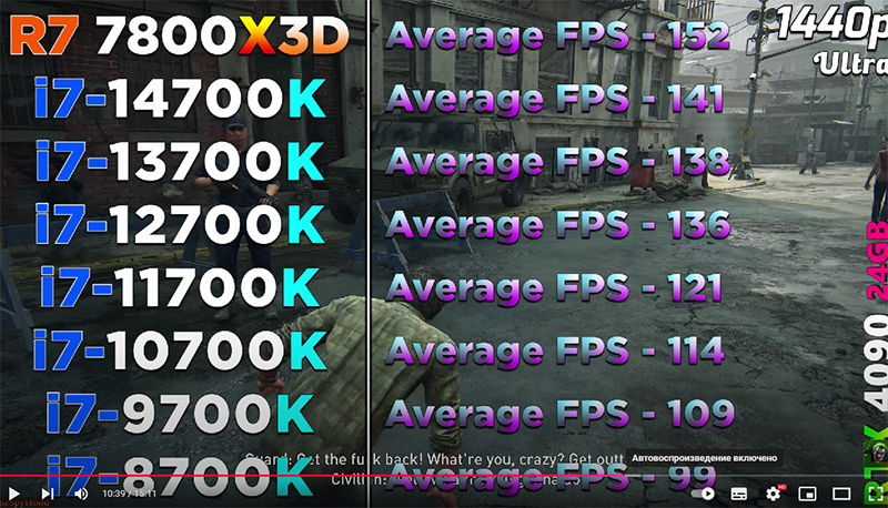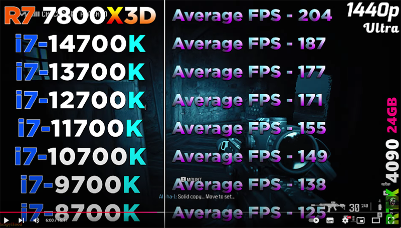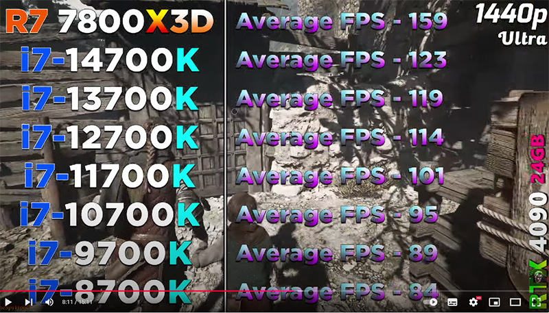 Пользователи, которые относят себя к числу разумных и продуманных, предлагают брать только то, что нужно для запуска игр и требовательных сценариев здесь и сейчас. Мощные процессоры рекомендуется игнорировать, но делать апгрейд компьютера как можно чаще. Это позволяет поддерживать системный блок в актуальном положении, а также не переплачивать за железо слишком много денег. Оба подхода кажутся логичными, ну а сегодня мы посмотрим, как показывают себя старые процессоры Intel, которые ещё совсем недавно считались самыми быстрыми и дорогими. Обратимся к тесту, проведённому на канале TheSpyHood. В качестве эталонного использовался Ryzen 7 7800X3D, тогда как все остальные камни были выпущены Intel. Сравнение начинается с Core i7-14700K, а после опускается всё ниже, достигая старого Core i7-8700K.