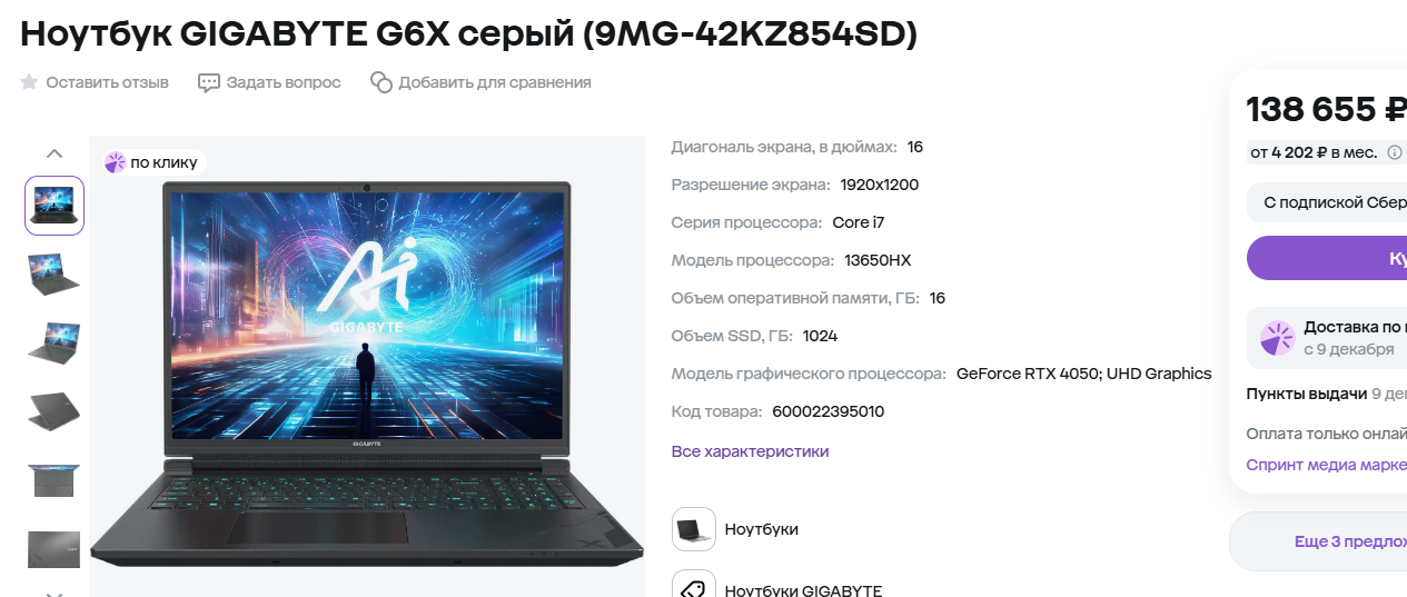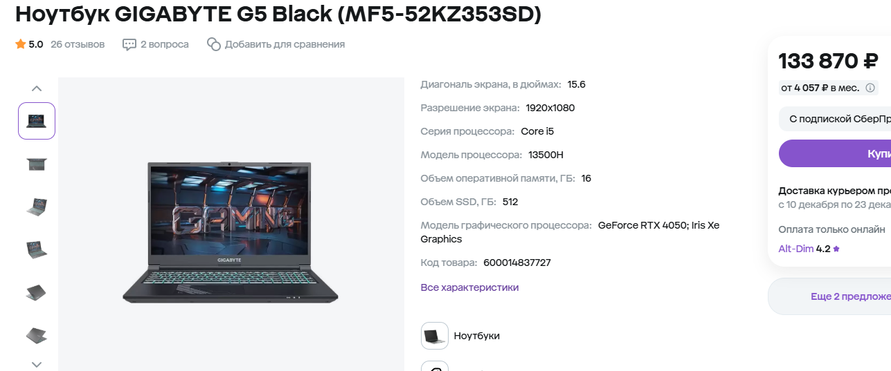 GIGABYTE G5 на 20 тысяч рублей дороже, но здесь вы платите за бренд, теряя в производительности и качестве картинки. Дисплей размером 15.6 дюйма в целом неплох, но поддержки 144 Гц он не даёт, при этом процессор Core i5-13500H пусть и новее указанного выше Core i7-12650H, но немного уступает ему по скоростным показателям. GIGABYTE G5 неплох, но только в том случае, если вы категорически против китайских брендов.