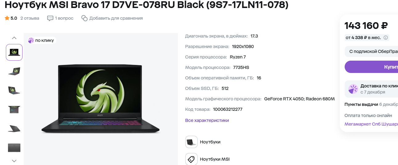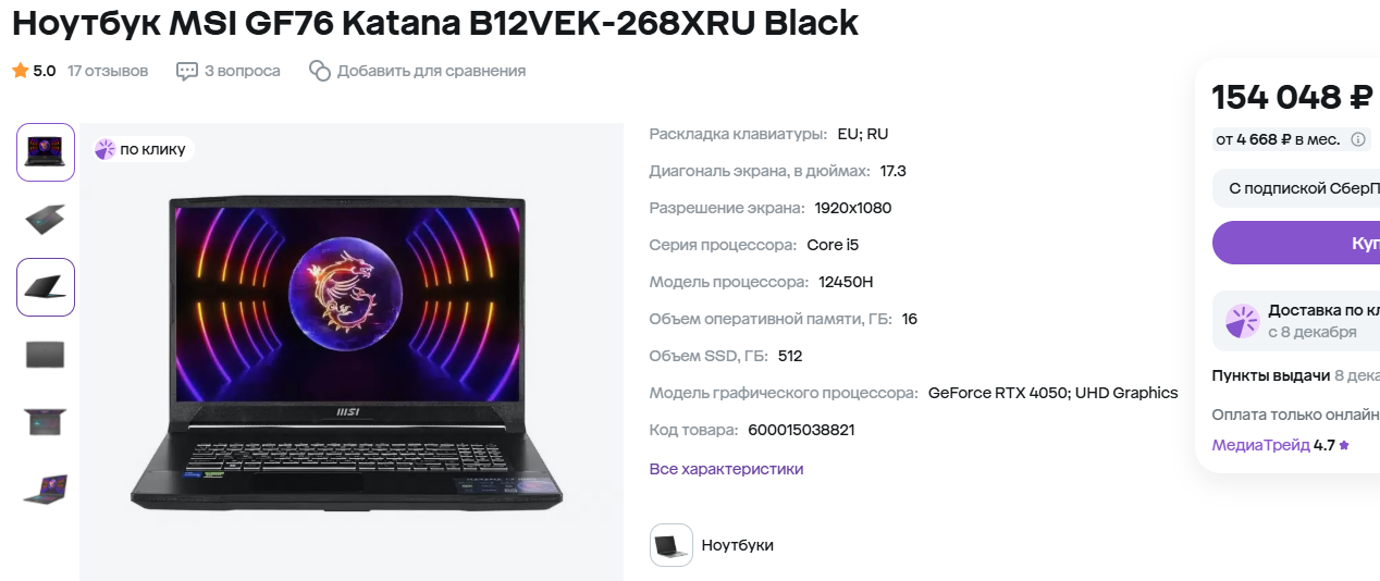 У MSI есть два любопытных продукта, каждый из которых может быть интересен по ряду характеристик. Смотрите, MSI Bravo 17 предлагает процессор Ryzen 7 7735HS, тогда как у MSI GF76 Katana в наличии только Core i5-12450H. Первый ощутимо быстрее в рабочих задачах за счёт мощного процессора, тогда как другой может похвастать экраном с поддержкой 144 Гц. MSI GF76 Katana геймерам понравится больше, но если вам нужно устройство для работы, то лучше приобрести Ryzen 7 7735HS. Оба имеют экран размером 17.3 дюйма, поэтому предложить высокий уровень компактности не способны.