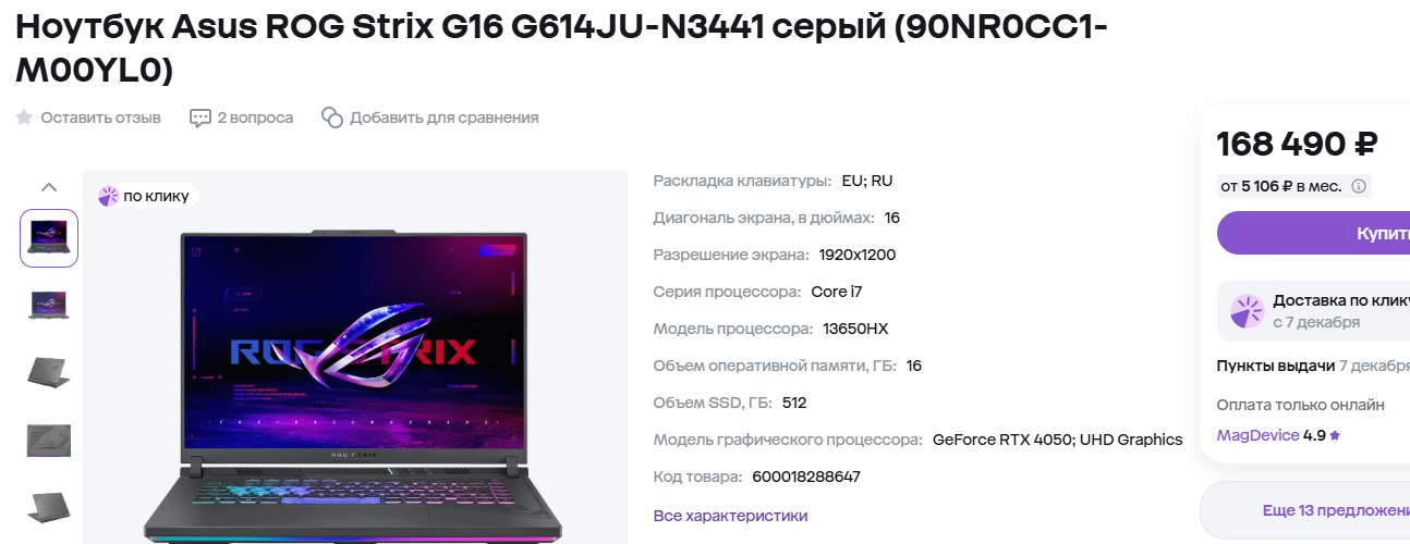 Если для вас игры – это не самое важное, то можно обратить внимание на Asus ROG Strix G16. Продукция этой тайваньской компании всегда стоит дороже аналогов от других брендов, хотя на этот раз здесь установлена довольно мощная начинка. Например, процессор Core i7-13650HX, качественный IPS-дисплей размером 16 дюймов и впечатляющие 165 Гц. Стоит всё это довольно дорого, но в данном случае вы получаете один из самых интересных ноутбуков на рынке, включающий видеокарту GeForce RTX 4050. Фанаты, ценящие продукцию Asus, точно не разочаруются, тогда как другим следует выбрать товар немного дешевле.