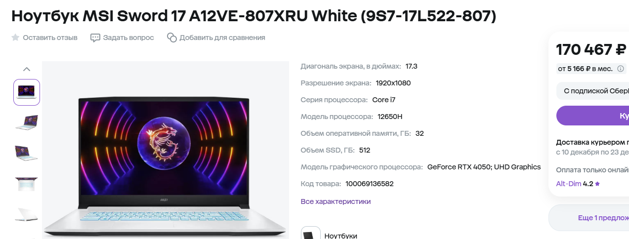 И поставим точку на MSI Sword 17. Данный ноутбук действительно дорогой, но назвать его игровым можно лишь отчасти. Дело в том, что перед нами модель, включающая 32 Гб оперативной памяти. Для игр столько не требуется, а это значит, что данный лэптоп больше подходит для рабочих задач. Не самый быстрый процессор Core i7-12650H не обладает заоблачной производительностью, а большой экран размером 17.3 дюйма понравится как любителям видеоигр, так и тем, кто планирует использовать MSI Sword 17 в других сценариях. Поддержка 144 Гб будет весьма кстати. Главным минусом такого устройства считается высокая стоимость.