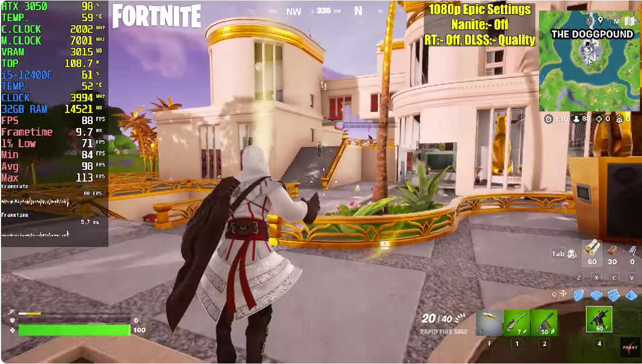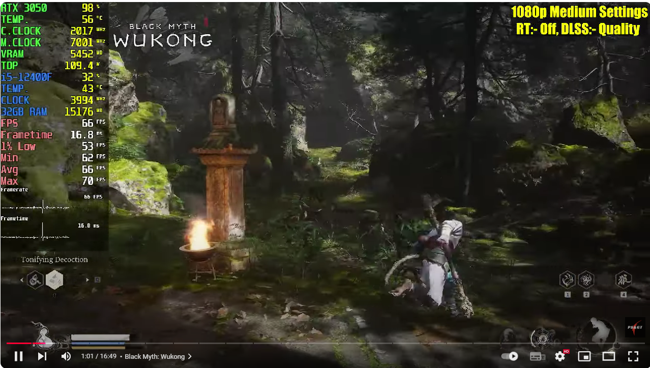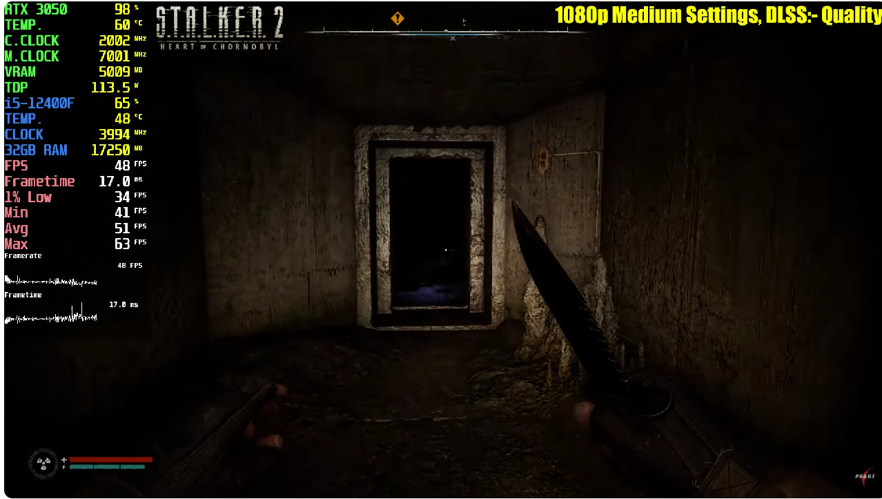 Согласимся, что даже это много, но к счастью есть и менее дорогие решения, с некоторыми из которых мы ознакомимся. Обратимся к тестированию, проведённому на канале PC Support & Gaming Test. Блогер использовал реалистичные параметры, а значит у рядового пользователя на компьютере будет примерно такой же фреймрейт. В качестве процессора задействовался Core i5-12400F, тогда как видеокарта ограничивалась GeForce RTX 3050. Настройки графики меняются в зависимости от требований той или иной игры, но в целом указанный выше комплект годится не только для покорения Grand Theft Auto V, но и для запуска S.T.A.L.K.E.R. 2: Heart of Chornobyl. В новой игре GeForce RTX 3050 едва не дотягивает до 60 кадров в секунду, но логика здесь заключается в использовании технологии масштабирования.