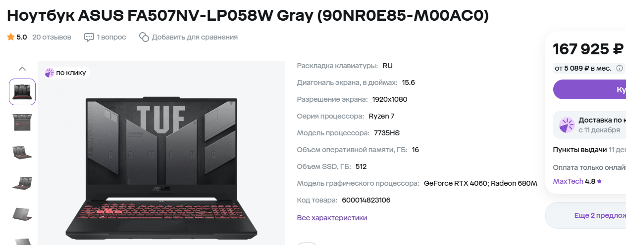 Очевидно, что многие наши читатели не захотят покупать незнакомые бренды, поэтому в той же ценовой категории доступна модель ASUS FA507NV-LP058W. Здесь всё те же 16 Гб оперативной памяти с накопителем объёмом 512 Гб. Присутствует бодрый процессор Ryzen 7 7735HS, а в целом ноутбук очень неплох и точно понравится геймерам. Частота обновления составляет 144 Гц, а размер дисплея стандартный и равен 15.6 дюйма. Можно добавить, что данная модель ничем не выделяется на фоне десятков других, но в данном случае многое решает магия ASUS. Перед нами один из самых успешных и дорогих брендов, а это очень важно для некоторых пользователей.