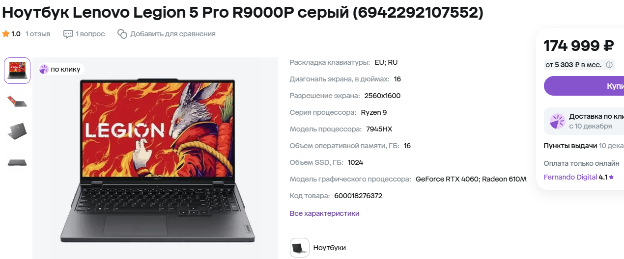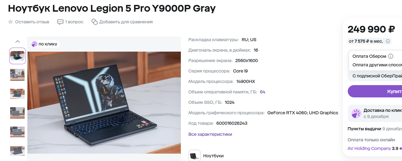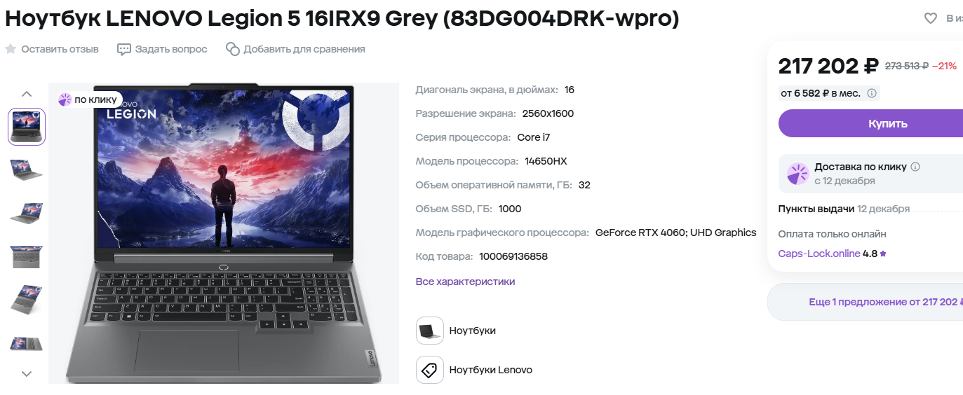 Иногда просто хочется порадовать себя крайне мощным ноутбуком. Логики в таком решении нет, ведь за 220 тысяч можно купить ноутбук с более быстрой видеокартой, но не следует забывать, что есть и другие характеристики. Если вы планируете не только играть, то Lenovo Legion 5 16IRX9 вам точно понравится. Обретите внимание, вы получаете свежий процессор Core i7-14650HX и очень качественный дисплей размером 16 дюймов. Разрешение экрана составляет 2К, а сам он поддерживает технологию 165 Гц. С таким ноутбуком не только приятно играть, но и выполнять любые другие задачи. Порадует наличие 32 Гб оперативной памяти и твердотельного накопителя ёмкостью 1 Тб. Словом, здесь собрано всё необходимое для тех, кто хочет получить максимальную комплектацию и надолго забыть о необходимости обращаться в магазин за новым лэптопом. Товар идёт с серьёзной скидкой, но цена всё равно довольно высокая.
