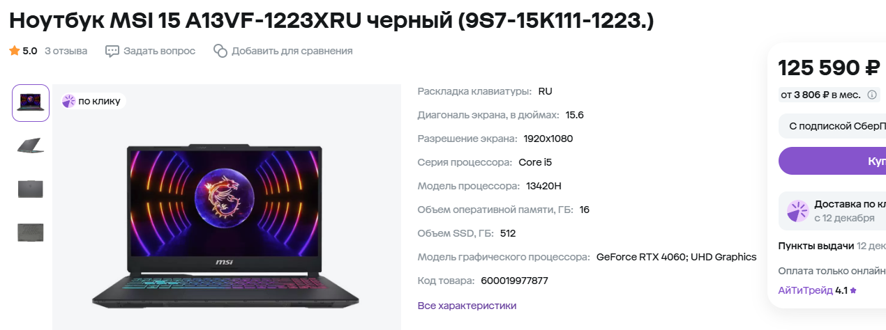 Примерно такой же потенциал имеет и MSI 15 A13VF-1223XRU. Здесь установлен стандартный дисплей с разрешением 1080р и игровыми 144 Гц. За счёт использования технологии IPS можно рассчитывать на высокое качество, а процессор Core i5-13420H ещё не успел устареть. Он не обеспечить высокой производительности в рабочих задачах, но геймерам это и не нужно. В играх решает видеокарта, а многочисленные тесты доказывают, что разница между самыми дорогими моделями с GeForce RTX 4060 от бюджетных решений почти отсутствует. Таким образом с MSI 15 A13VF-1223XRU вы получите тот же уровень быстродействия, что и доступен владельцам лэптопов за 200 тысяч рублей.