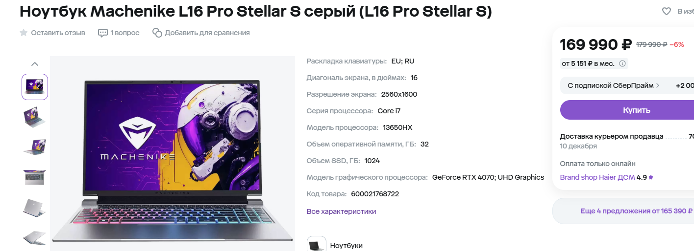 Machenike L16 Pro Stellar S интересен тем, кто не боится купить чистокровного китайца. А между тем выбор окупится сторицей, поскольку кроме процессора Core i7-13650HX здесь ещё и можно встретить 16-дюймовый экран с разрешением 2К. Дисплей выполнен по технологии IPS и выдаёт впечатляющие 240 Гц. Немного ниже вы увидите, что примерно такие же модели популярных брендов стоят намного дороже, ну а Machenike L16 Pro Stellar S почти не имеет минусов. Здесь не только в наличии 32 Гб видеопамяти, но и установлен накопитель объёмом 1 Тб. Предположим, что указанные выше модели ноутбуков предлагают SSD известных брендов, ну а Machenike – это китаец в полном смысле этого слова. Если вас такие слова не пугают, то всего за 170 тысяч рублей вы сможете получить то, что недоступно фанатам известных брендов.