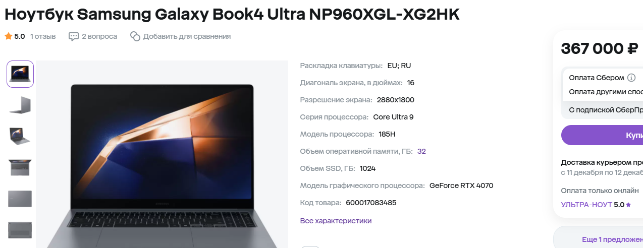 Ну и поставим жирную точку с помощью очень дорогого Samsung Galaxy Book4 Ultra. Прежде всего здесь вы сможете найти процессор Core Ultra 9 185H. Это не только самый новый, но и самый быстрый камень на рынке. Хотелось бы за такие деньги получить 32 Гб оперативной памяти, но производитель решил немного сэкономить. Твердотельный накопитель также не балует рекордной ёмкостью, но на первое время точно хватит. Ноутбук компактный, но не выделяется на фоне других чем-то особенным. По крайней мере до тех пор, пока вы его не включите, ведь экран здесь выполнен по технологии AMOLED. Это гарантирует картинку невероятного качества, позволяя получить просто невероятный игровой опыт. Ноутбук слишком дорогой, но для тех, кто не привык считать деньги, он точно станет идеальным подарком под новогоднюю ёлочку.