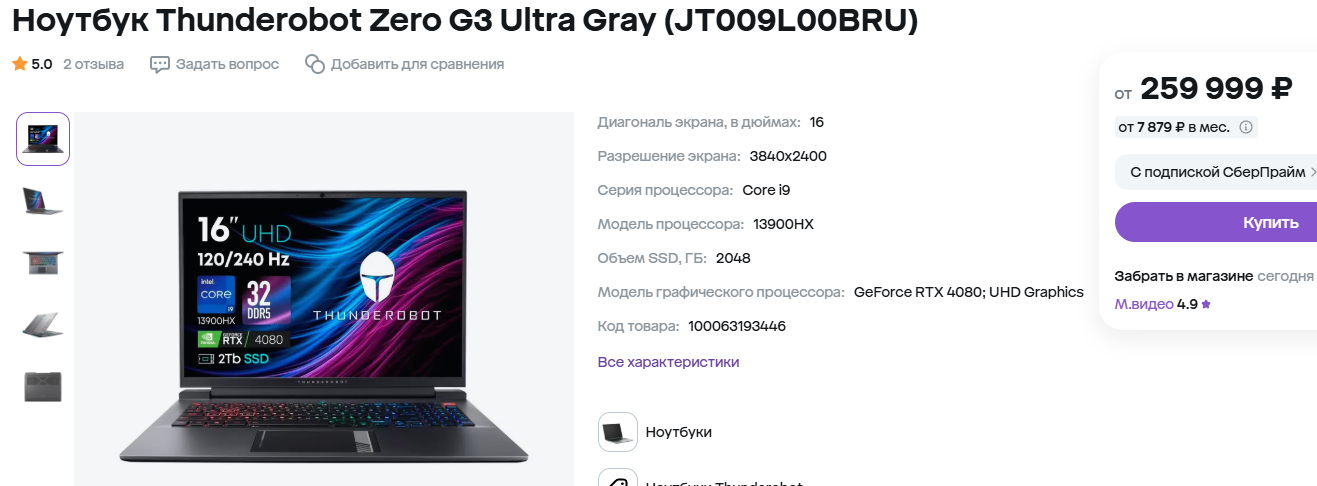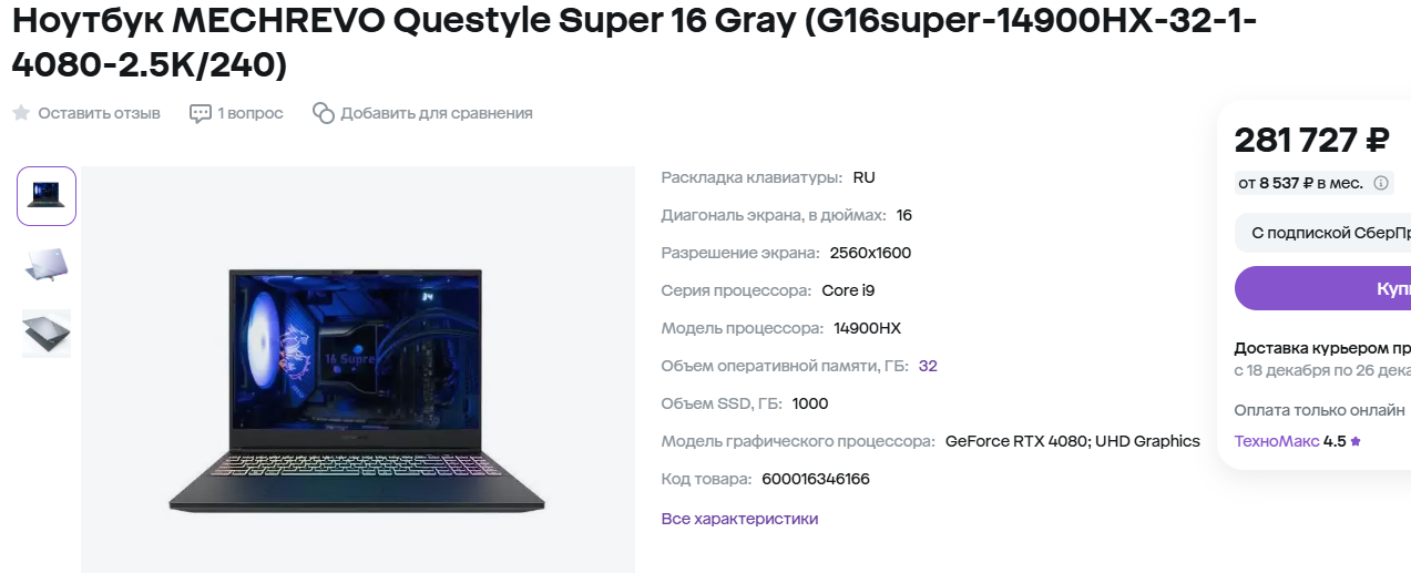 Ну и завершим нашу подборку устройством для тех, кто не против чистокровных китайцев. MECHREVO Questyle Super 16 по характеристикам похож на указанный выше лэптоп MSI, но стоит на целых 60 тысяч рублей дешевле. Учитывайте, что экран здесь лучше и предлагает частоту обновления 240 Гц. Установлен более свежий процессор Core i9-14900HX, тогда как другие характеристики аналогичны. Пожалуй, если вы хотите сэкономить, то экран с разрешением 2К вас точно устроит, ведь быстродействие обеспечивается процессором и видеокартой. Ну а с этим проблем точно не будет.