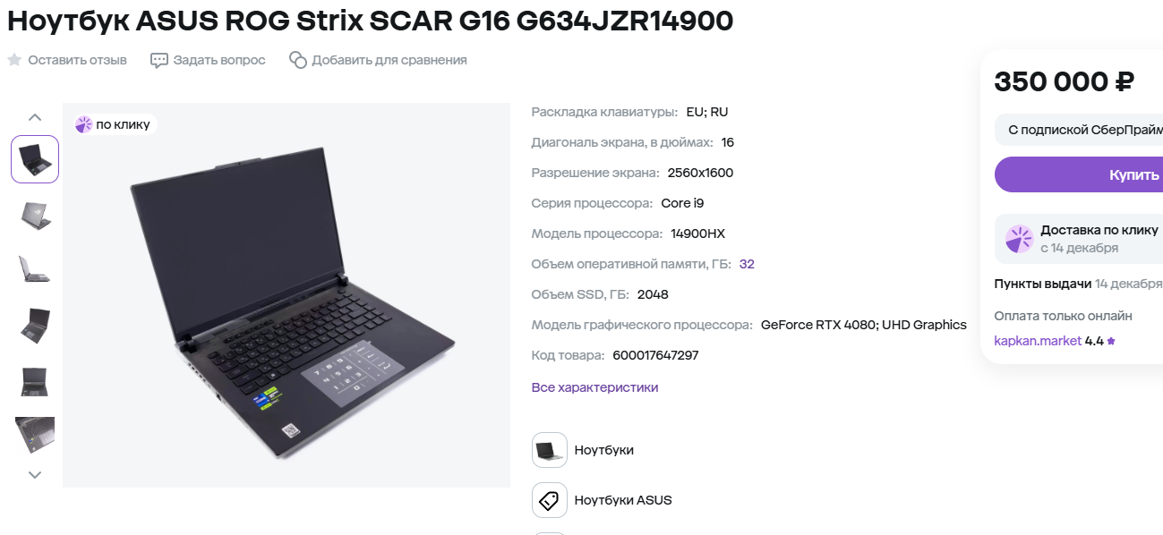 Сегодня мы изучим 9 наиболее интересных ноутбуков, которые можно встретить в Мегамаркете. В списке есть дорогие модели, стоимость которых поражает воображение, но присутствуют и бюджетные решения. Давайте начнём с ASUS ROG Strix G16 G614JZ-N4087W. Данная модель не способна удивлять, ведь здесь 16 Гб оперативной памяти и твердотельный накопитель ёмкостью 512 Гб. Установлен стандартный для такого типа устройств дисплей с разрешением 2К и размером 16 дюймов. Сам экран качественный, но ждать от него заметных прорывов мы бы не советовали. Медленный ноутбук не назовёшь, ведь он построен на процессоре Core i7-13650HX, ну а за 220 тысяч ничего дешевле точно нет. Учитывайте, что речь идёт об известном бренде, а значит данный ноутбук ASUS понравится тем, кто хочет получить максимально быструю видеокарту, ноне нуждается в продвинутом процессоре и самой лучшем дисплее на рынке.