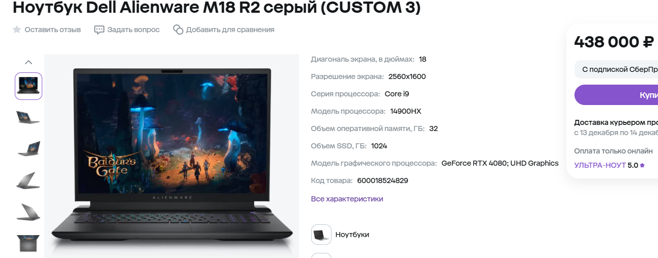А вот Dell Alienware M18 R2 выглядит разочаровывающе. Возможно, сам бред и кажется некоторым геймерам очень солидным, но это не оправдывает скудные характеристики и откровенную жадность сборщиков. Да, здесь стоит всё тот же флагманский камень Core i9-14900HX, но разрешение не выше 2К, а частота дисплея равна 165 Гц. Для модели за 250 тысяч рублей такой экран считался бы неплохим, но ведь Dell Alienware M18 R2 стоит значительно дороже 400 тысяч. При этом экономия заметна повсеместно. Например, внутри стоит твердотельный накопитель ёмкостью 1 Тб. 32 Гб ОЗУ вам хватит, ну а главной изюминкой ноутбука считается большой размер экрана. Он равен 18 дюймов и создан для тех, кто не стремится к излишней компактности. Отметим, что за 440 тысяч характеристики могли бы и лучше, но ноутбук точно найдёт своего владельца.