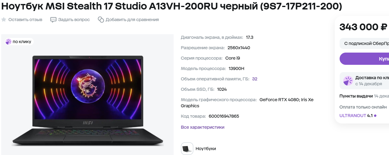 Для сравнения предлагаем обратить внимание на MSI Stealth 17 Studio A13VH-200RU. Процессор немного старее, но разницу в скорости будет заметить почти невозможно, поскольку Core i9-13900H хорошо справляется не только с играми, но и с рабочими задачами. Здесь всё тот же накопитель объёмом 1 Тб и 32 Гб ОЗУ, но хотя бы ниже цена. При этом вы получаете экран размером 17.3 дюйма с частотой обновления 120 Гц и разрешением 2К. Можно сделать вывод, что эта модель выгоднее, хотя в нашей подборке есть ноутбуки других производителей, которые выглядят намного интереснее.