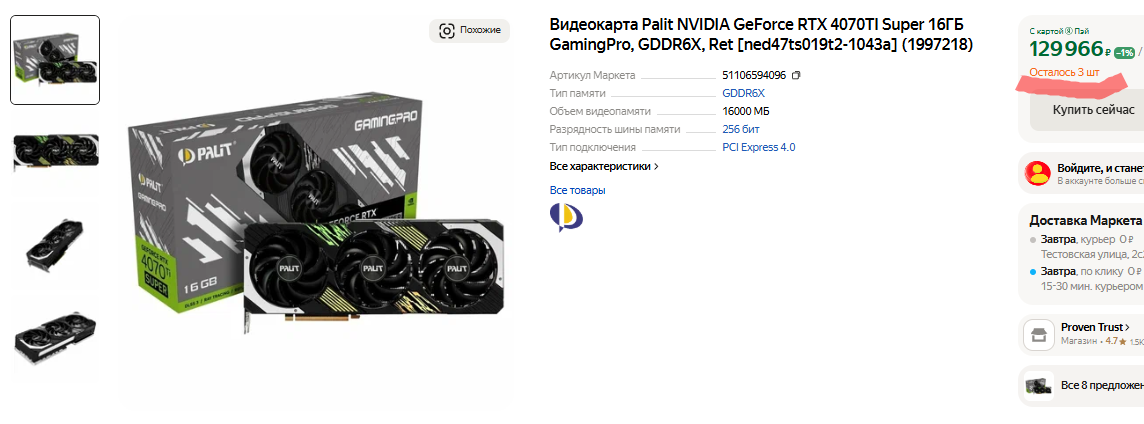 Похоже, продавцы намерены использовать проблему дефицита с целью извлечения дополнительной прибыли. Повторимся, что на розницу давит глобальная нехватка графических чипов, ну а всё это приводит к вполне ожидаемым последствиям. Как видите, GeForce RTX 4070 Ti SUPER, за которую ещё неделю назад просили около 100 тысяч рублей, совершенно неожиданно подорожала на 20 тысяч. Брать такую видеокарту мы вам также не советуем. В тестах она на 30% уступает новинке, но, когда дело доходит до использования технологии масштабирования, предлагает в два раза меньший фрамрейт. Можно сколько угодно критиковать DLSS, но сегодня без технологии масштабирования запускать игры в разрешении 4К с трассировкой лучей и максимальном качестве графики уже невозможно.