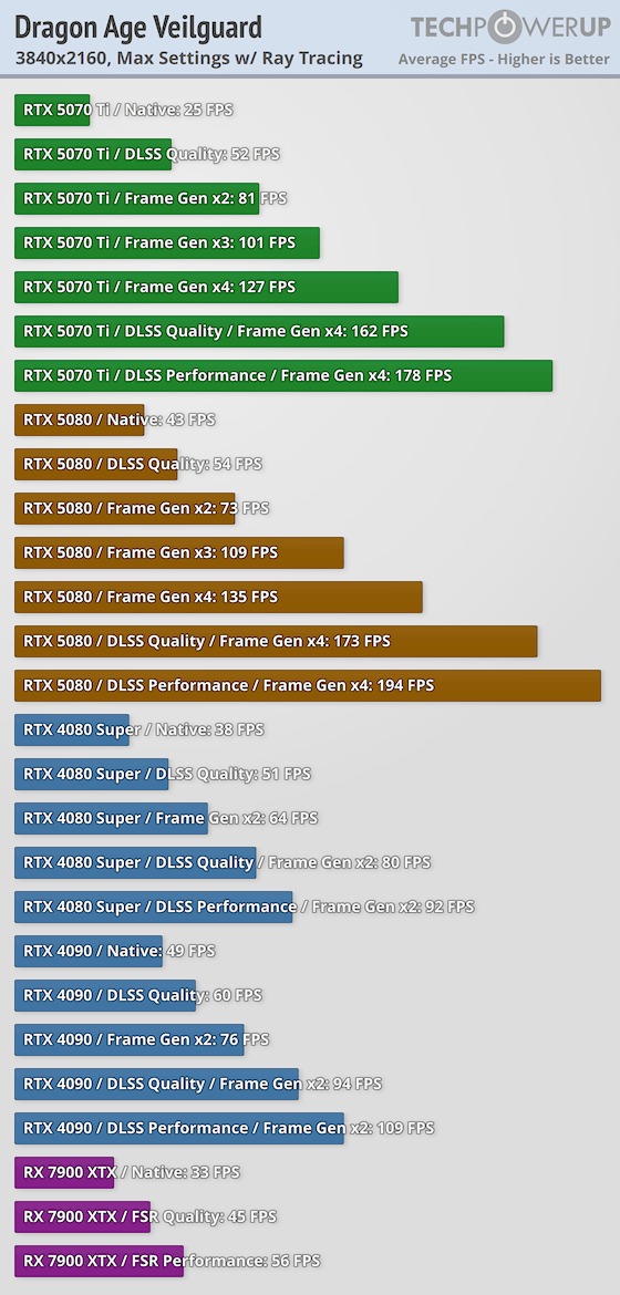 Крупные магазины отмечают, что следующая поставка состоится через несколько недель, предлагая геймерам запастись терпением. Ожидается, что дефицит продлится до конца второго квартала текущего года, а значит перед энтузиастами стоит сложный выбор. Вчера мы уже видели, насколько быстрой оказалась GeForce RTX 5070 Ti. В тестах без использования дополнительных технологий новинка в среднем обходит GeForce RTX 4070 Ti SUPER на 30%, ну а эти заметный прирост между поколениями. В итоге видеокарта предлагает уровень производительности более дорогой GeForce RTX 4080 SUPER, но стоит 750 долларов. Как вы уже поняли, купить видеокарту нельзя даже за 1000 долларов, но в данном случае нам важно лишь то, что со временем геймеры заметят выгоду от перехода на новое поколение настольной графики. Главной же особенностью GeForce RTX 5070 Ti, которая вызывает бурные восторг фанатов NVIDIA, стала технология масштабирования. DLSS 4.0 использует умные алгоритмы нового поколения, что позволяет увеличить количество кадров в секунду в 3-4 раза. Обратите внимание на изображение выше. GeForce RTX 4080 SUPER, которая примерно равна новинки в трассировке лучей и традиционном рендеринге, не способна тягаться с GeForce RTX 5070 Ti, когда дело доходит до технологий нового поколения. Именно этот факт побуждает геймеров переплачивать за GeForce RTX 5070 Ti, ну а мы изучим, как обстоят дела в российской рознице.