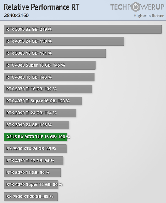 Radeon RX 9070 можно назвать перспективной, но пользоваться спросом она будет до тех пор, пока в магазинах не появится GeForce RTX 5070. Стоимость видеокарты AMD заметно завышена, ну а мы уже не раз видели, что Лиза Су с неохотой снижает рекомендованные цены даже спустя месяцы после релиза. Значительные изменения мы наблюдаем в сценариях с использованием трассировки лучей. Здесь можно заметить, что Radeon RX 9070 успешно конкурирует с GeForce RTX 5070, уступая ей не более 5%. Таким образом волшебные лучи больше не являются бутылочным горлышком настольной графики AMD, хотя инженеры NVIDIA всё ещё по этому показателю остаются лидерами. Кстати, в разрешении 4К по непонятной причине GeForce RTX 5070 и вовсе оказалась на 10% медленнее Radeon RX 9070, когда дело дошло до трассировки лучей. Происходящее вызывает удивление и может быть связано с несколькими факторами. Например, авторы теста просто ошиблись. Не исключено, что дело в драйверах, а значит отставание будет нивелировано совсем скоро. Вполне возможно, что дело в архитектуре и наличии у видеокарты NVIDIA 12 Гб видеопамяти, тогда как AMD предлагает 16 Гб. В 4К требуется как можно больше ресурсов, ну а дядюшка Хуанг предпочитает экономить.