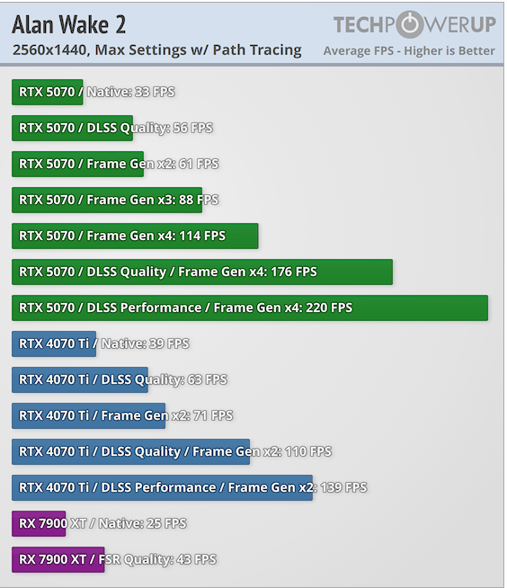 Обратите внимание, FSR 4 способна на каждый реальный кадр генерировать ещё один виртуальный. Таким образом можно получить в 2 раза больше fps с минимальным снижением качество картинки. Неплохо, вот только DLSS 4 научилась на каждый реальный кадр генерировать 2 или даже 3 виртуальных, при этом качество изображения остаётся высоким. Если перевести всё это в простые цифры, то с GeForce RTX 5070 вы получите 150 кадров в секунду в разрешении 4К, активной трассировкой и выкрученными на максимум настройками DLSS 4, тогда как Radeon RX 9070 будет генерировать скромные 75 fps. Для комфортной игры достаточно и этого, но время не стоит на месте. Требования к играм растут, а разработчики всё меньше внимания уделяют оптимизации. Таким образом жизненный цикл GeForce RTX 5070 окажется выше на несколько лет, ну а это важная составляющая, которая определяет выбор каждого конкретного геймера. На самом деле не всё так печально, ведь AMD выпустила также Fluid Motion Frames 2.1 (AFMF 2.1). Данная технология работает на уровне драйвера, позволяя увеличить количество кадров в секунду в 2 раза. В итоге если активировать FSR 4 и AFMF 2.1 одновременно, то можно сравняться с DLSS 4. В теории, ведь влияние технологий AMD на картинку изучено плохо, а тесты доказывают, что агрессивные сценарии приводят к резкому снижению качества изображения.