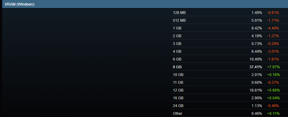 Запускать игры в 2К на высоких настройках графики не получится, а в итоге дорогостоящий ноутбук устареет ещё до того, как окажется на прилавке магазина. Это же относится и к настольным видеокартам, а многие эксперты рекомендуют думать перед покупкой. Если обратиться к материалу авторов PC Games Hardware, то становится ясно, что падение фрамрейта – это не выдуманная проблема. Причина в том, что актуальные игры остро нуждаются в большом объёме памяти, ну а новинки последних лет легко проглатывают больше 10 Гб скоростной видеопамяти. Тесты однозначны и были не раз подтверждены другими экспертами. А между тем, если обратить внимание на статистику Steam, то вырисовывается любопытная картина. Смотрите, почти 75% всех геймеров имеют на руках видеокарты, количество памяти в которых меньше или равно 8 Гб. Особенно настораживает, что 25% владеют видеокартами, количество памяти на которых меньше или равно 4 Гб, ну а это не хватит даже для многих популярных шутеров. Таким геймерам остаётся только запускать нетребовательную классику, а также проекты от небольших студий, где графика соответствует началу 2000-го года.