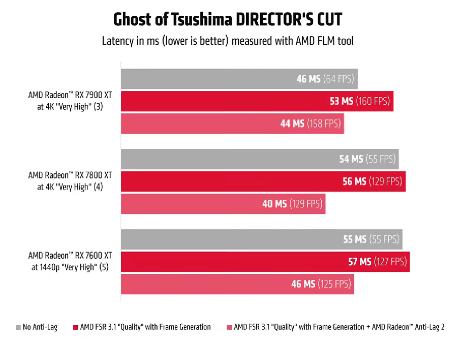 Тесты проводились на разных видеокартах и показывают эффективность работы технологии масштабирования прошлого поколения. Серая полоса – это запуск игры без FSR. Средняя полоса соответствует автоматическим настройкам с ориентировкой на качество. Как видите, в этом случае фрамрейт заметно вырос, тогда как задержка всё ещё остаётся низкой. Нижняя полоска актуальна в том случае, если вы запускаете не только технологию масштабирования, но и фирменные алгоритмы снижения задержки. Как видите, количество кадров остаётся высоким, а задержка заметно снижается. Всё это актуально на прошлом поколении видеокарт AMD и работает ещё более эффективно с настольной графикой новой серии. К сожалению, технологии масштабирования имеют свои минусы. Если внимательно смотреть на детали, то картинка после запуска FSR 4 или DLSS 4 кажется немного разочаровывающей. Что бы там не писали маркетологи, но убрать все проблемы пока не удалось никому. Особенно артефакты заметны на огромных мониторах после перехода на 4К. К счастью, всё это проблема владельцев видеокарт за 100 тысяч рублей, тогда как обычные геймеры могут комфортно запускать игры в 2К даже с видеокартой, имеющей всего 8 Гб памяти. Технологии масштабирования позволяют увеличить жизненный цикл видеокарты, а сегодня это единственная возможность, позволяющая противостоять жадности производителей.