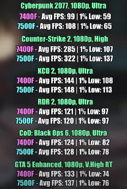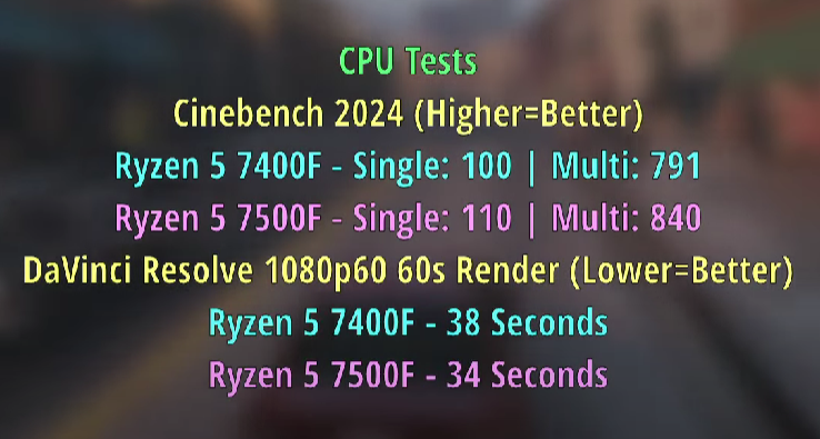 Геймеры тратят на видеокарты сотни тысяч рублей, а также выбирают процессоры, цена на которые превышают все разумные пределы. Сегодня мы разберём итоги любопытного тестирования, которое недавно было опубликовано на канале RandomGaminginHD. Авторы использовали два недорогих процессора, пытаясь выявить различия между ними и пользу от переплаты. Проще говоря, нужно ли тратить деньги на более дорогой камень, если вы планируете использовать его исключительно в игровых сценариях? Речь шла о Ryzen 5 7500F и Ryzen 5 7400F, сравнение которых вы можете найти ниже. Прежде всего отметим, что Ryzen 5 7400F представляет собой точную копию более дорогого Ryzen 5 7500F и отчается пониженной тактовой частотой на 300 МГц (4.7 ГГц против 5 ГГц). Его рекомендованная стоимость стартует со 110 долларов, ну а мы изучим тесты, которые выявляют производительность самого процессора.