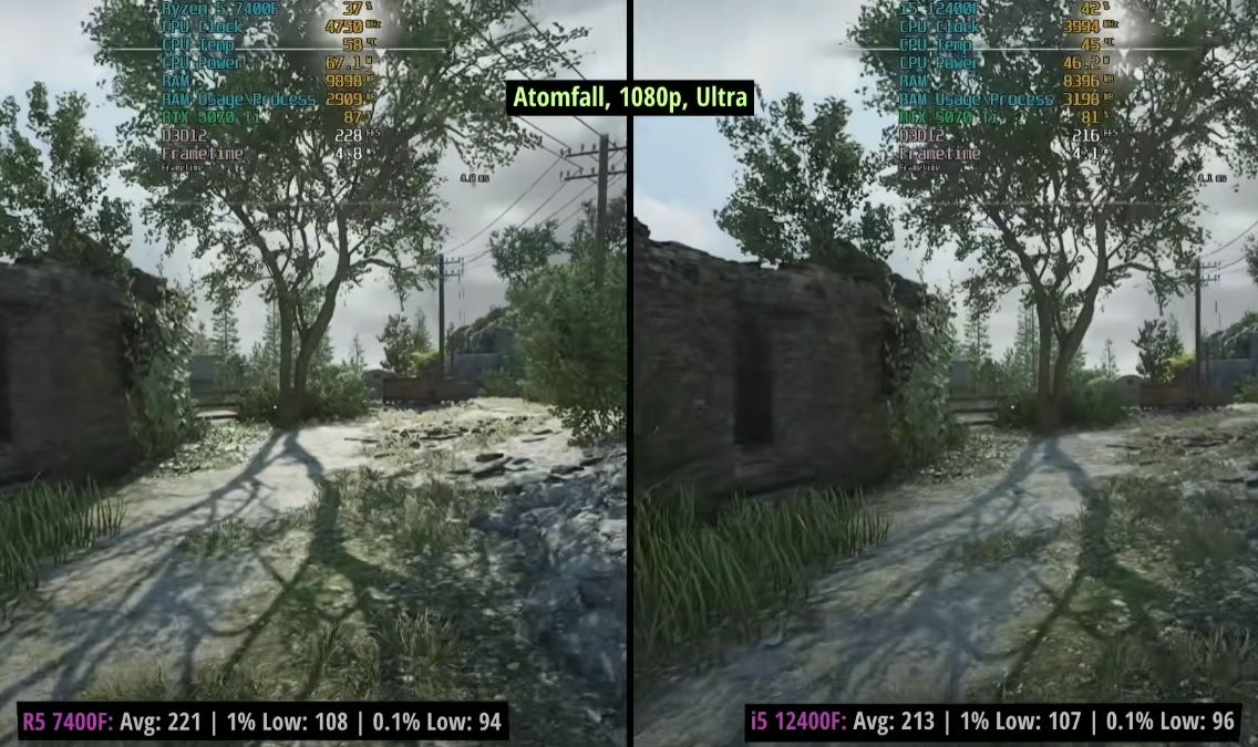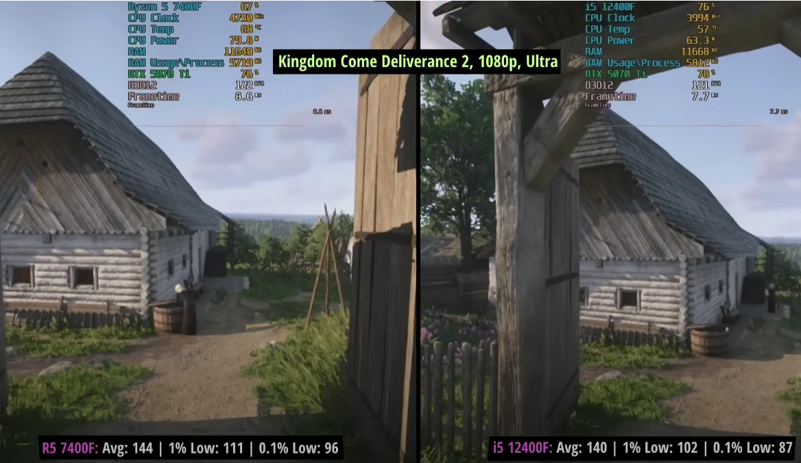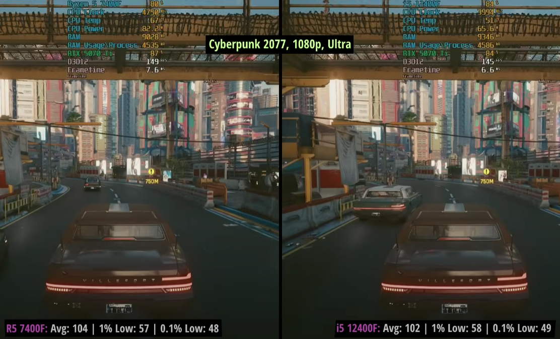 Прежде всего порадуем фанатов AMD. Ryzen 5 7400F пусть и ненамного, но быстрее. Например, в Atomfall камень Intel отстал на 4%. Kingdom Come: Deliverance II старенький Core i5-12400F позади на 3%, тогда как в GTA V Enhanced Ryzen 7400F вырывается вперёд на целых 4%. В Cyberpunk 2077 разница составляет примерно 2%, ну а более заметное преимущество процессора AMD зафиксировано в Counter-Strike 2, где разрыв составляет 10%. Если учитывать, что количество кадров в этой игре намного выше трёх сотен, то визуально определить отличия не выйдет. Можно констатировать, что оба процессора примерно равны, но это ещё не все результаты тестов. Если внимательно присмотреться, то авторы использовали GeForec RTX 5070 Ti. Эта видеокарта стоит около 150 тысяч рублей и даже в европейской рознице встретить её дешевле 1000 евро проблематично. Если представить себе, что вместо мощной видеокарты последнего поколения представители RandomGaminginHD взяли бы решение за 35 тысяч, то разницу не удалось бы выявить даже в синтетических тестах. Ну а поскольку всё упирается в деньги, то самое время понять, как подобные выводы повлияют на конечного потребителя.
