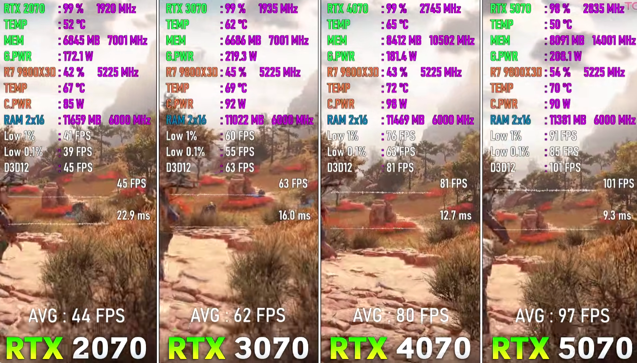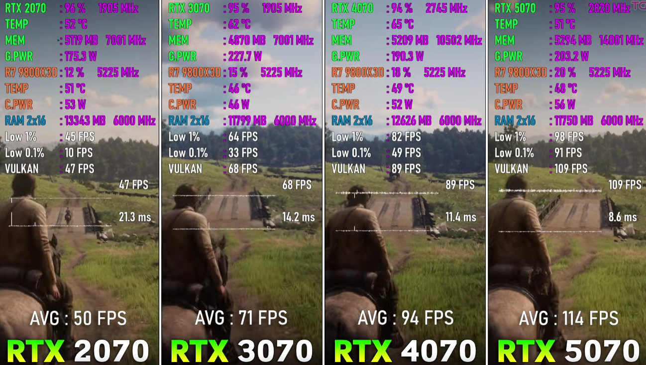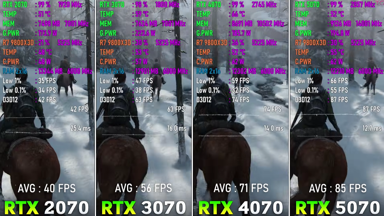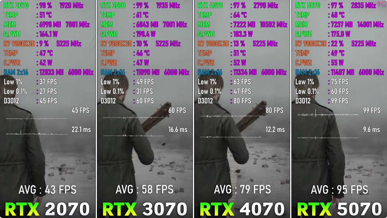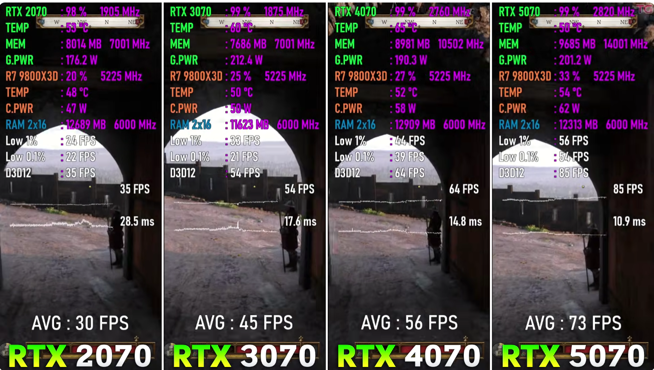 Сегодня мы остановимся на тестировании, проведённом на канале Testing Games. Автор сравнил всю линейку GeForce RTX начиная от серии GeForce RTX 20 до новой GeForce RTX 50. Как уже было сказано, внимание было сосредоточено на серии GeForce RTX хх70, ну а мы изуми результаты. Напомним, GeForce RTX 2070, а также все предыдущие видеокарты данной серии всегда обладали высокой производительностью и предназначались для продвинутых любителей видеоигр. Такие видеокарты получали длительный жизненный цикл, обладая высоким потенциалом по разумной стоимости. Что любопытно, цены на эти видеокарты не сильно изменились, а вот прежнего потенциала уже нет. В ходе тестирования удалось выяснить, что GeForce RTX 2070 примерно в 2 раза медленнее GeForce RTX 5070. Подобные результаты неподготовленному геймеру могут показаться значительными, но на самом деле это не так. Если вспомнить, что GeForce RTX 2070 появилась в продаже в середине 2018, а GeForce RTX 5070 стала доступна в апреле 2025, то между ними 7 лет и 3 полноценных поколения.