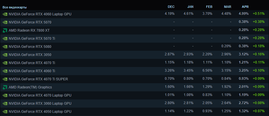 Мобильная GeForce RTX 4060 уже достаточно давно удерживает лидерство, поэтому ничего нового здесь нет. А вот дальше нас ожидают сюрпризы. Обратите внимание, на второе место ворвалась GeForce RTX 5070. Учитывайте, что это первое появление этой видеокарты в списке, при этом она настолько востребована, что смогла занять вторую строчку в месячном топе. Результат 0.38% с нуля впечатляет, в чём мы убедимся немного ниже. Видеокарта получила 12 Гб памяти, но многие эксперты ругают её за минимальный прирост быстродействия. На самом деле GeForce RTX 5070 действительно не тянет на прорыв, поскольку всего на 5% быстрее GeForce RTX 4070 SUPER. В то же время благодаря высокому потенциалу в работе с технологией масштабирования четвёртого поколения новинка может быть более интересна конечному потребителю. Высокий спрос на GeForce RTX 5070 доказывает её ценность, а значит видеокарта у NVIDIA действительно востребована.