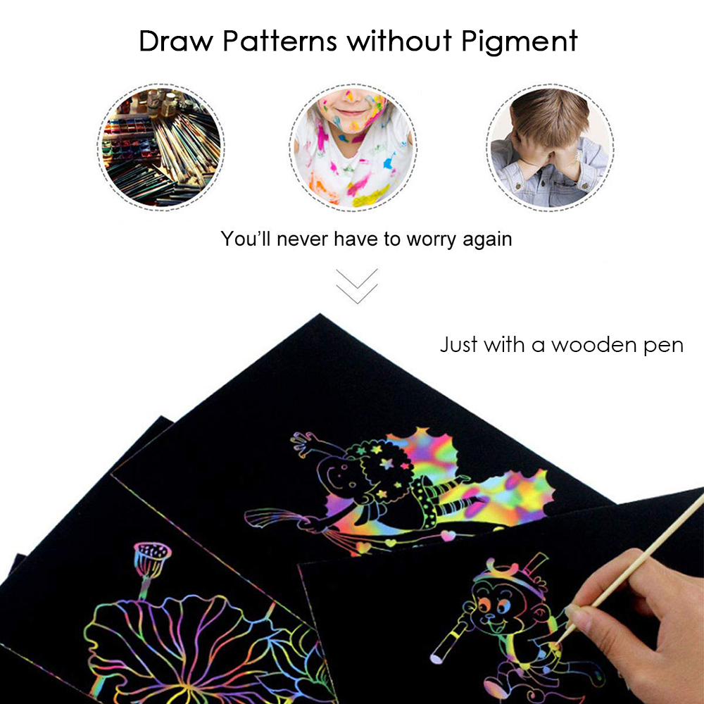 Возможно, это один из самых необычных подарков, которые можно подарить ребёнку для развития творческого потенциала. Радужная бумага представляет собой черный лист бумаги размером 28х21 сантиметр. Лист состоит из нескольких слоёв: первый легко стирается при помощи любого тонкого твёрдого предмета, а под ним находится радужный слой, который переливается всеми цветами радуги. Ребёнок берет идущий в комплекте карандаш и стирая верхний слой получает необычный рисунок. Что и говорить, если даже обычные каляки-маляки выглядит завораживающе. В комплекте 50 листов бумаги. По словам уже купивших радужную бумагу, первое время можно часами сидеть и рисовать, рисовать, рисовать…