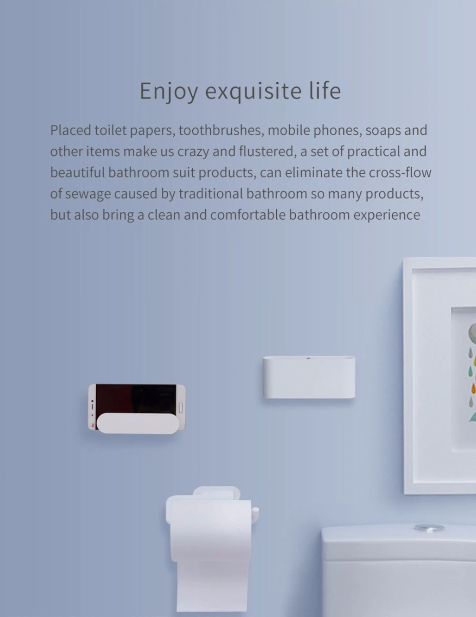 Ничего более нужного, чем набор 5 в 1 для ванной комнаты и представить сложно. Комплект включает: держатель мобильного телефона, держатель туалетной бумаги, ёмкость для жидкого мыла с дозатором, коробочку для хранения зубной щётки, коробку для хранения мелких принадлежностей. Все приспособления выполнены из прочного пластика и не подвержены вредному воздействию влаги. На задней стороне приборов есть клейкая лента, на которую они крепятся к ровной гладкой поверхности. Производитель предупреждает, что после приклеивания желательно не трогать приборы в течение 24 часов, после чего они с лёгкостью могут выдерживать предназначенный для них вес. Кроме удобства гаджеты для ванной от Xiaomi могут похвастать приятным строгим дизайном. Они неприхотливы в обслуживании и легко моются.