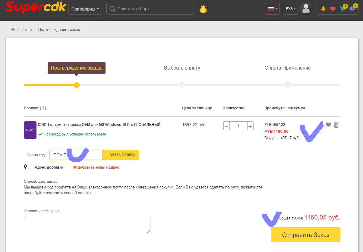 Представители магазина Supercdk отмечают, что после перехода по ссылкам вы увидите немного иную цену. Она предназначена для других покупателей, в то время как наши читатели могут воспользоваться эксклюзивным купоном «OCVIP». Давайте кратко рассмотрим процесс покупки.
