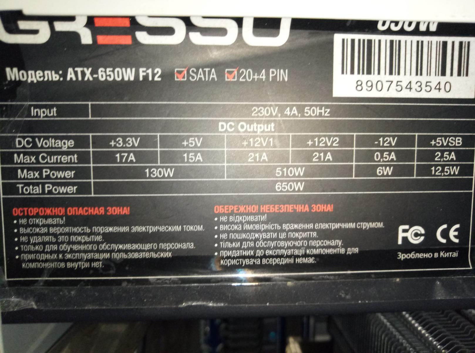 Блок питания от фирмы GRESSO ATX-650W F12
