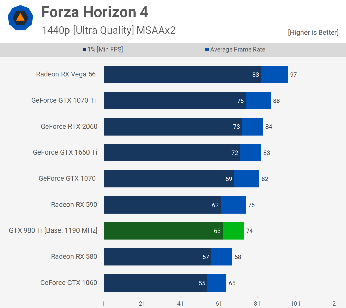 В Forza Horizon 4, GTX 980 Ti смог сравниться только с Radeon RX 590, что на 10% медленнее, чем у 1660 Ti и RTX 2060.