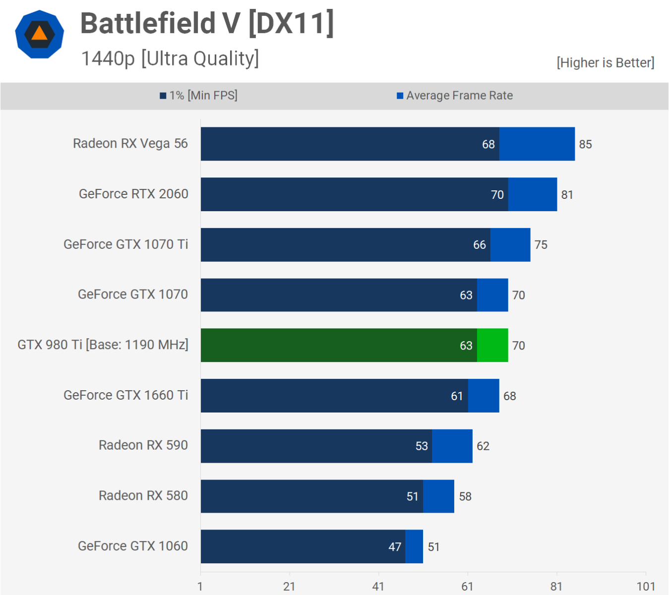 При тестировании в Battlefield V мы видим, что разогнанный GTX 980 Ti находится на одном уровне с GTX 1070 и GTX 1660 Ti.