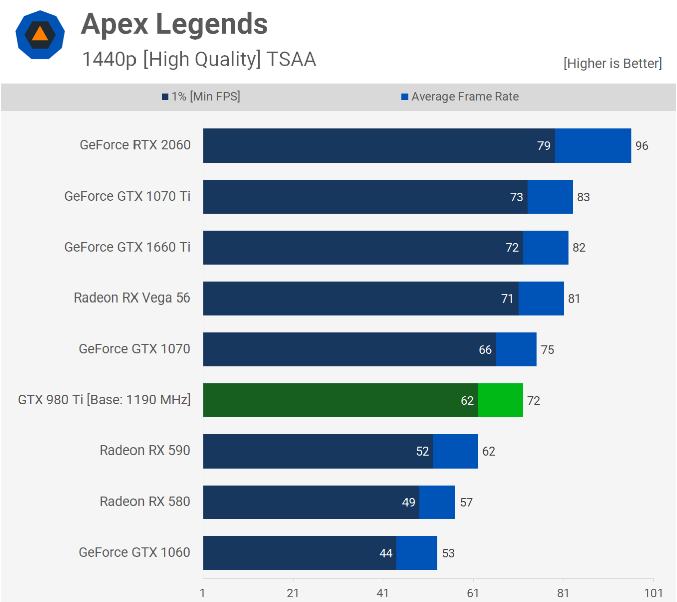 Apex Legends - одна из новейших игр, которые мы тестируем, и, как вы можете видеть, разогнанный GTX 980 Ti отстает от GTX 1070, GTX 1660 Ti и значительно отстает от RTX 2060.