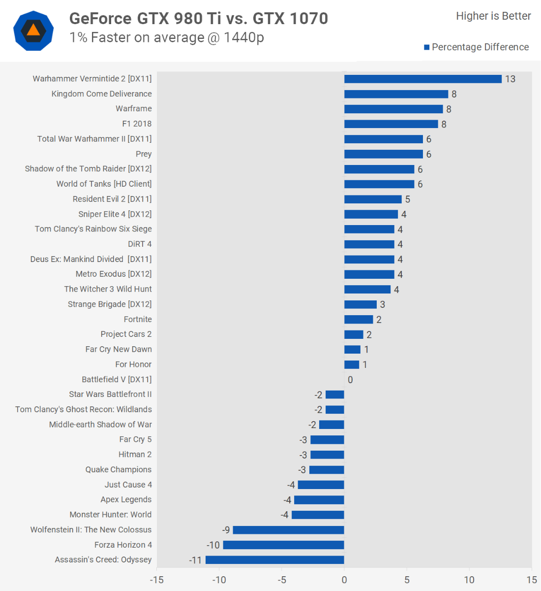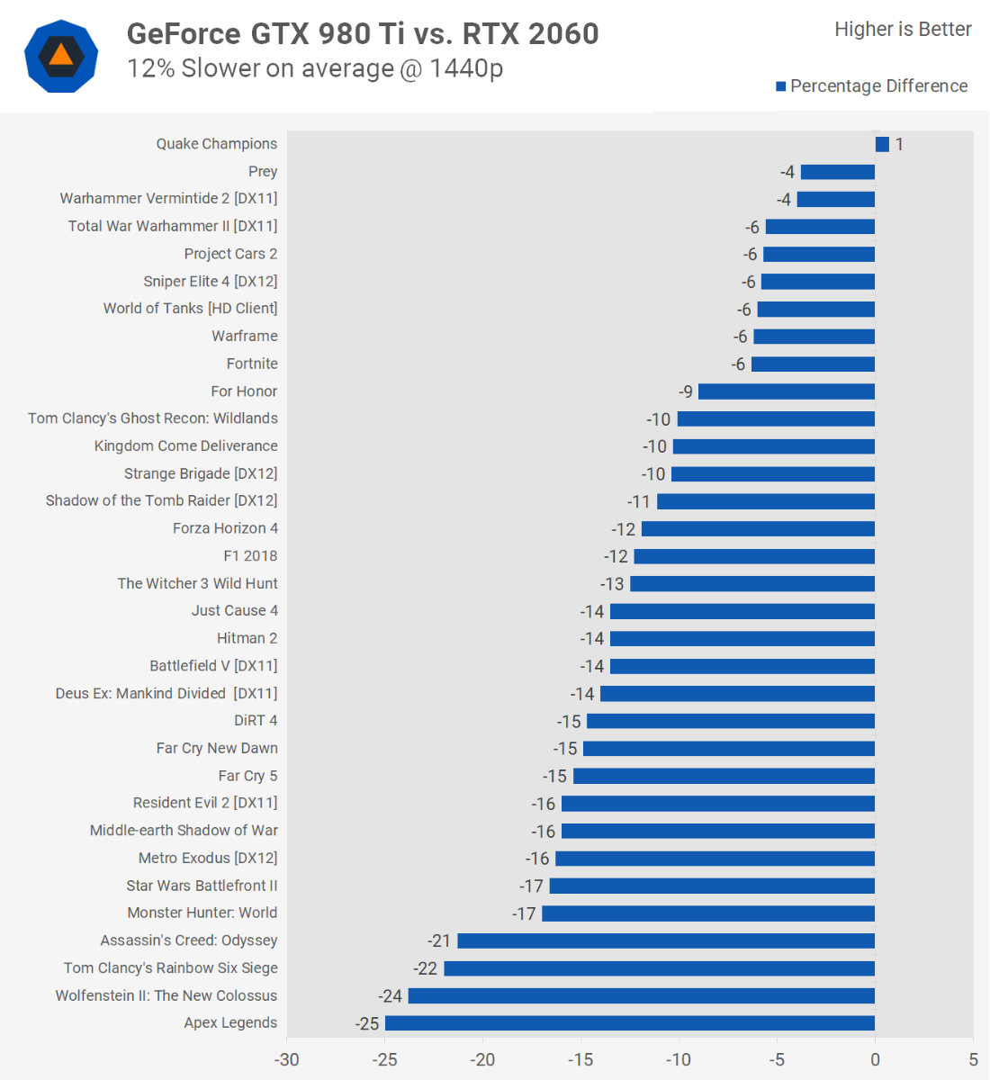 В среднем GTX 980Ti уступает 12%, но также были случаи, когда она была на 20-25% медленнее, например, в Assassin's Creed Odyssey, Rainbow Six Siege, Wolfenstein II и Apex Legends.