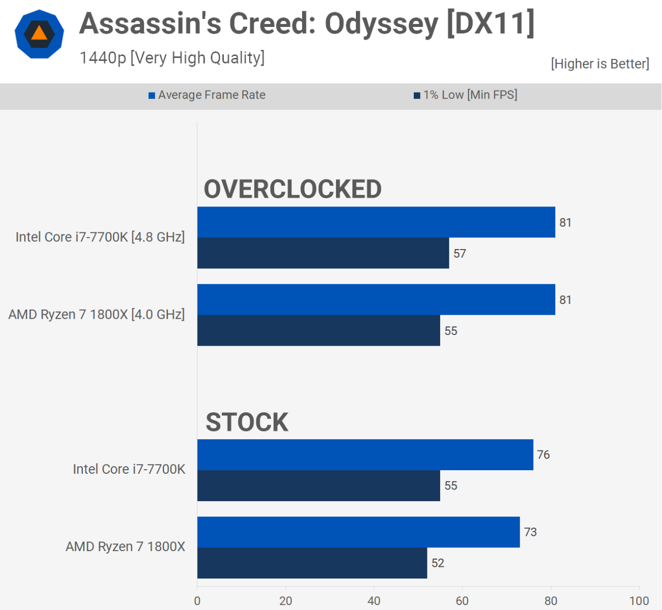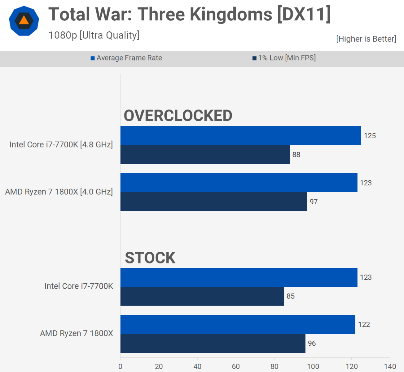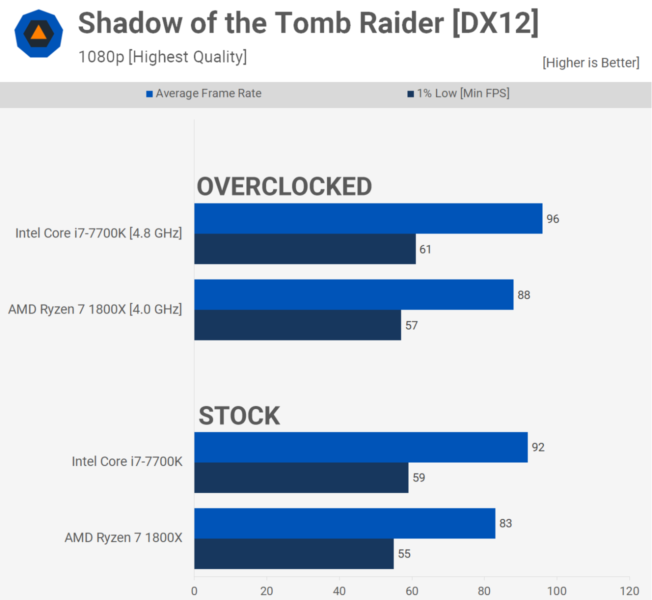Для современных игр Core i7-7700K и Ryzen 7 1800X в целом равны. Существуют легковесные игры, в которых 7700K обладает значительным преимуществом по частоте кадров, но во всех этих играх 1800X по-прежнему обеспечивает плавную работу. Между тем, в более требовательных играх 7700K начинает находить свои пределы.