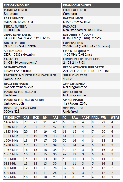 Данный модуль типа LRDIMM с информационной ёмкостью 64 ГБ соответствует стандарту DDR4-2933Y, микросхемы которого основаны на ревизии ядра C-die 18 нм, оперирующие на номинальной тактовой частоте 1466,66 МГц с соответствующими задержками основных управляющих сигналов 21-21-21-47. Модуль имеет содержательную техническую документацию, а также прилагаемые к нему дампы с картой SPD – CVFB0, CVFС0, CVFG0. Выбор на него пал не случайно, ведь нам необходим высокочастотный модуль, который для обеспечения совместимости с «железом» предыдущего поколения мог бы оперировать на пониженных частотах согласно стандарта JEDEC JESD79-4 – 1333,33 МГц, 1200 МГц, 1066,66 МГц, 800 МГц и 666,66 МГц. Но, как мы знаем, CPU-Z, AIDA64 и HWINFO по-своему рассчитывают частоты для так называемых в обывательской среде «JEDEC-профилей».