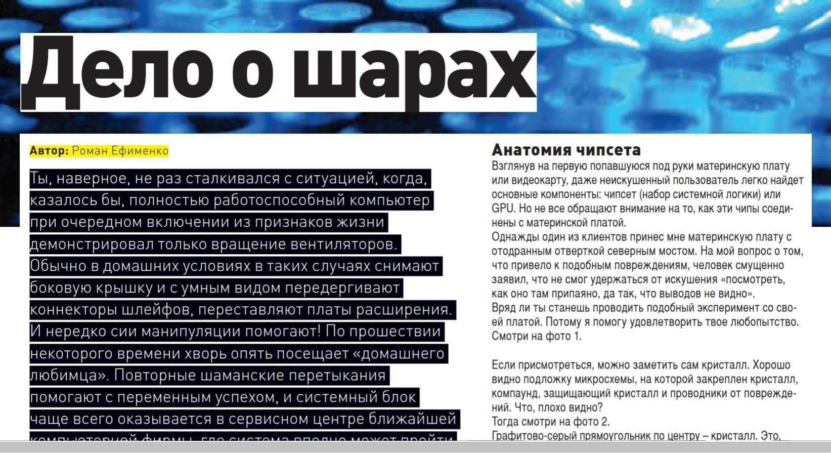 В "Железе" большая практическая статья о ремонте BGA чипов. Владельцы новеньких NVIDIA GeForce 8800-9800 GT/GTX еще не подозревают, что вскоре им это очень пригодится.