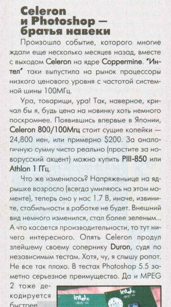 Начну как обычно, с обзоров железа. Выходит Celeron 800 на ядре Coppermine.