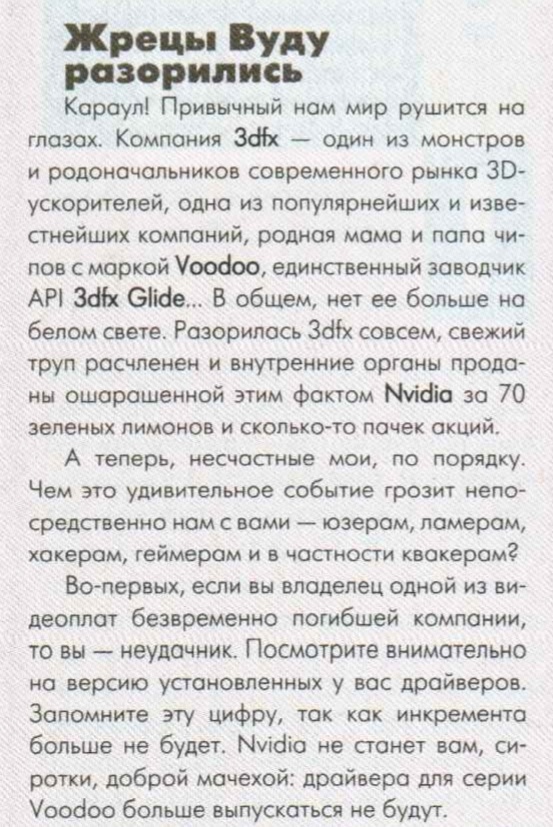 3Dfx разоряется. Еще на одного игрока на рынке ПК железа меньше, еще один шажок к той монополизации, в которой мы живем сейчас.