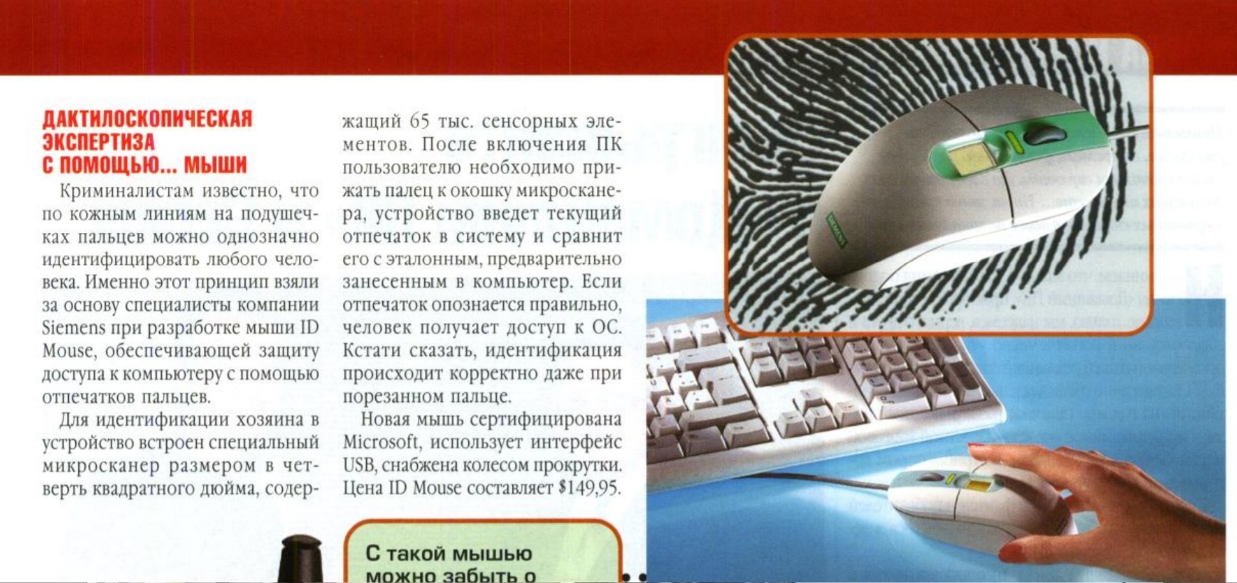 Интересная мышь, сейчас, когда в смартфонах все чаще ставят дактилоскопические датчики, это было бы очень удобно, но почему-то не прижилось в мышах.