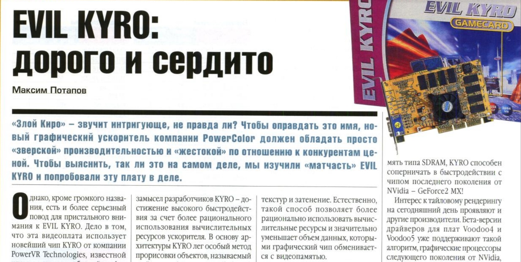 Обзор видеокарты PowerColor EVIL KYRO на базе чипсета KYRO, представляющем собой 3-е поколение семейства PowerVR. Конкурент GeForce2 MX.
