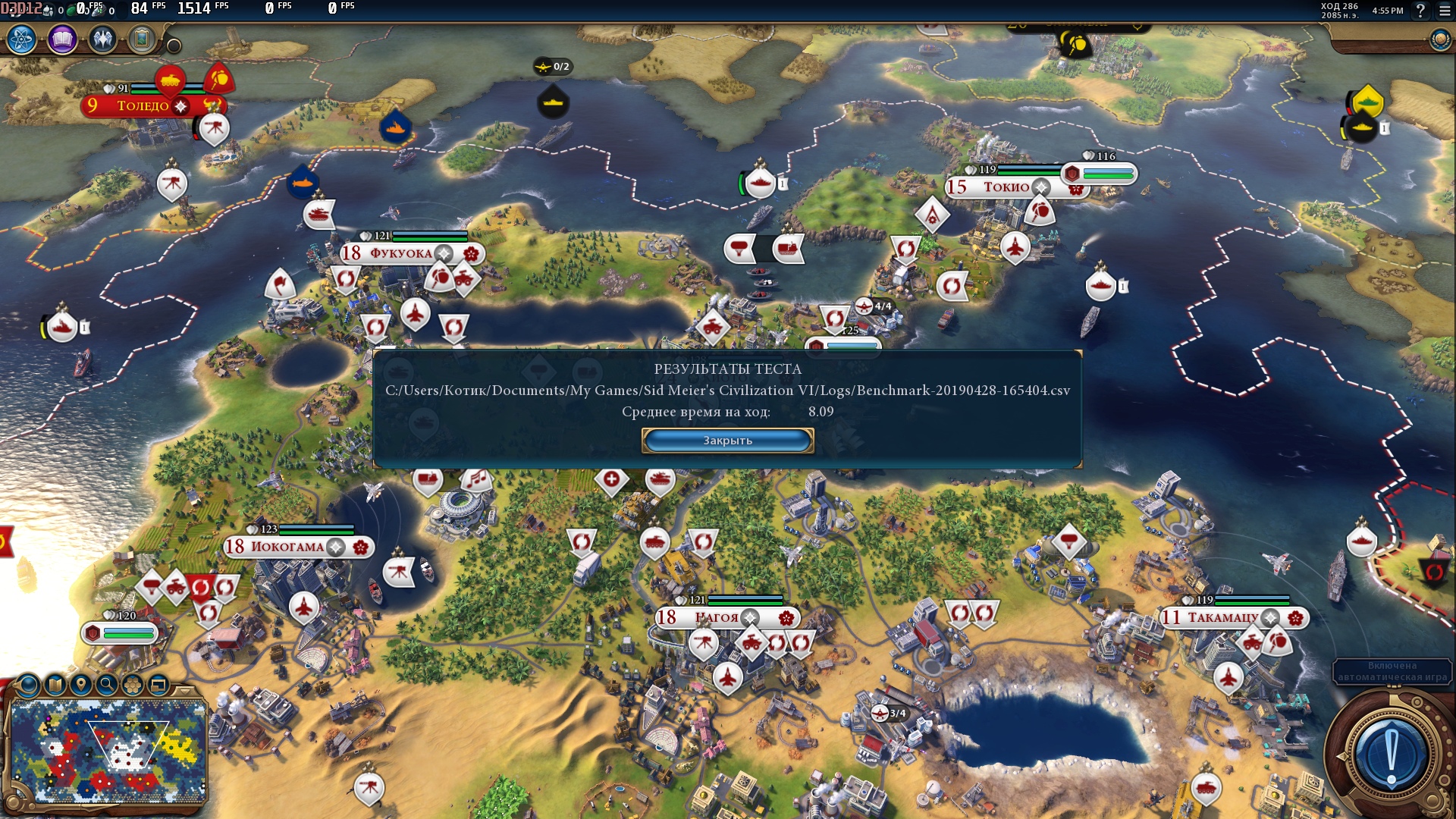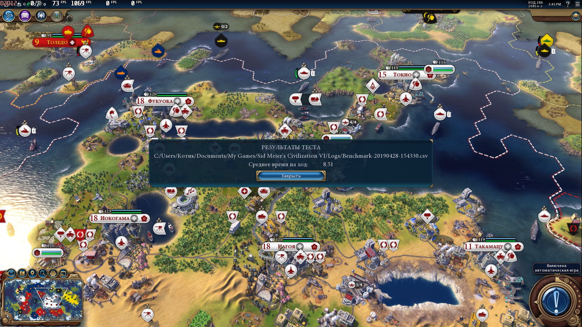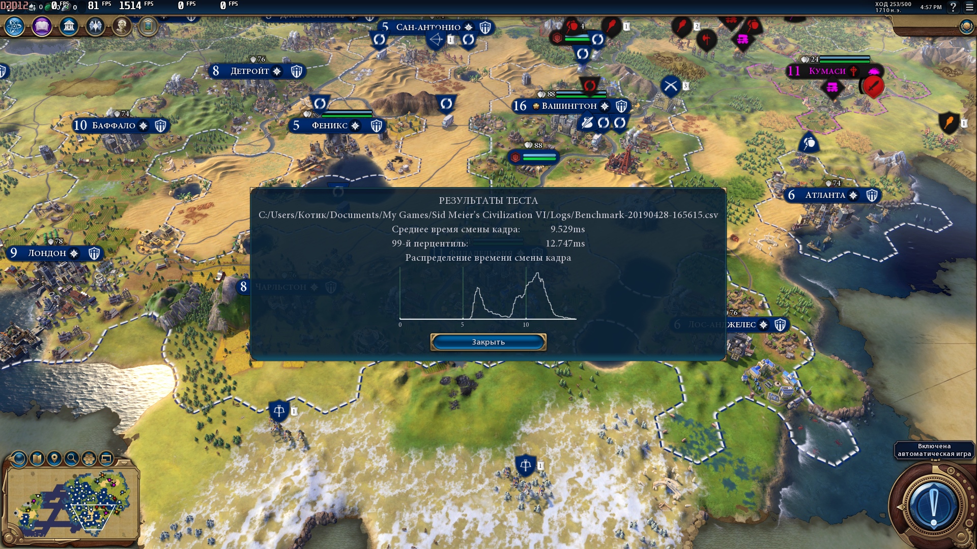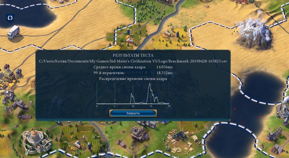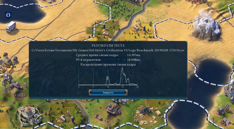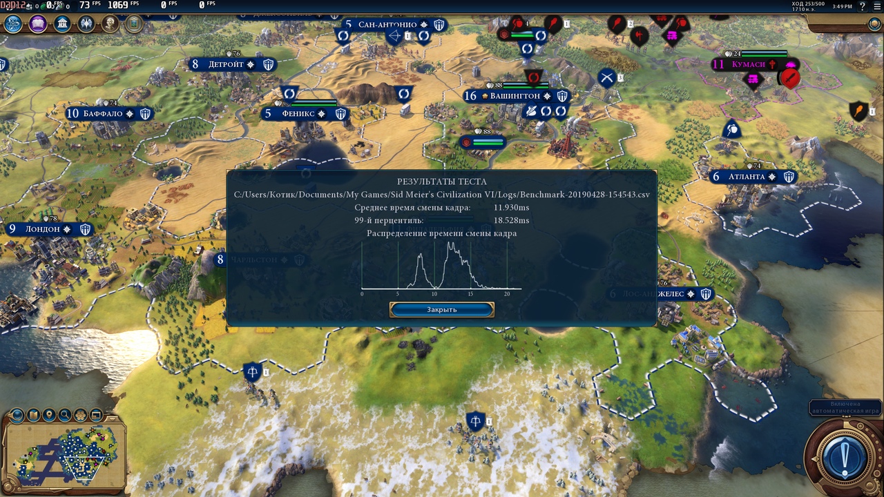 Средний fps 71,1. По 99-й перцентилю 54 fps. Прироста от установки дополнительных 8 ГБ памяти и работы в двухканальном режиме в разрешении UHD в Цивилизации 6 нет. Жаль, но и без него неплохо.