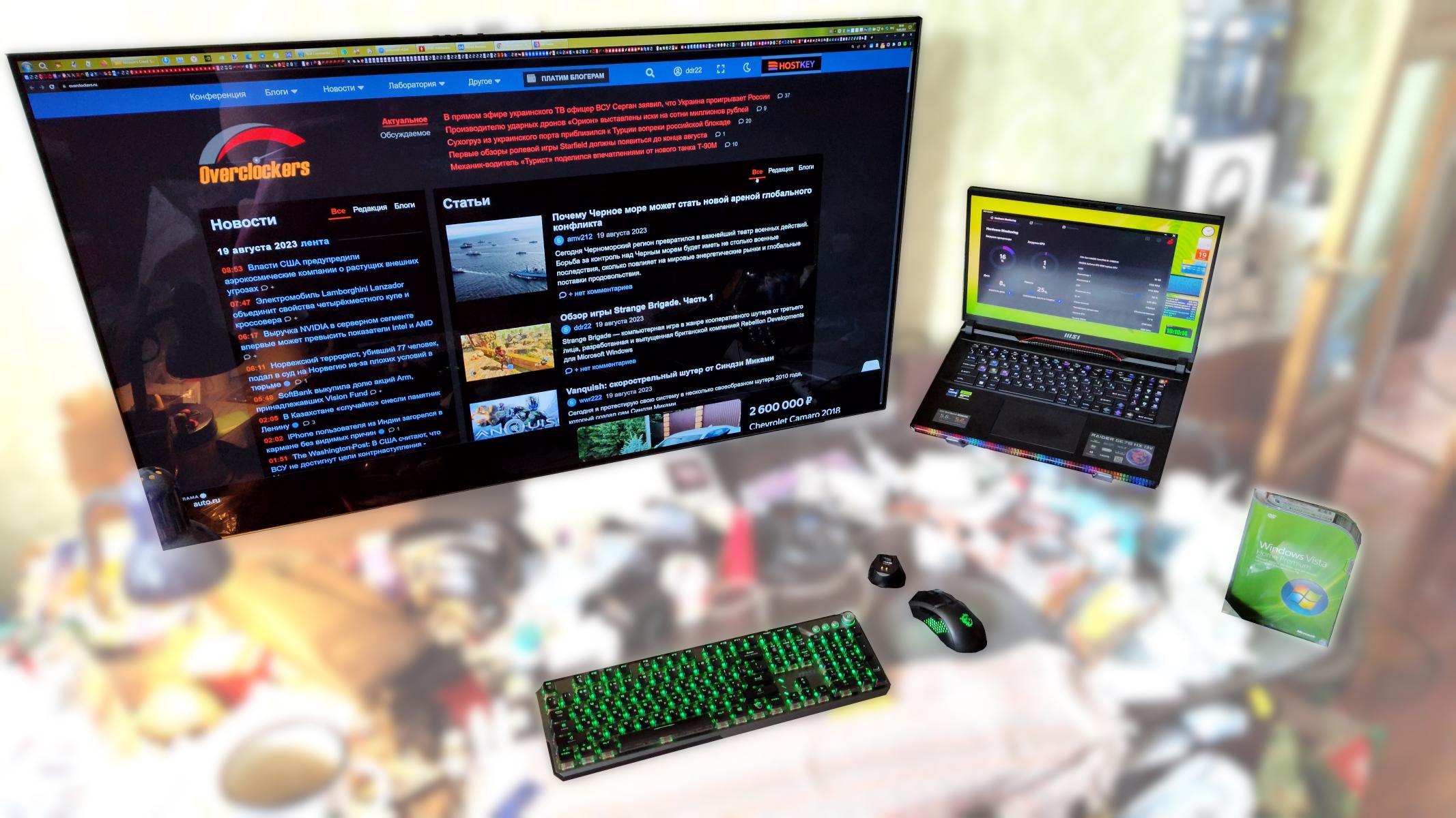 Так выглядит мой текущий сетап. GE78HX находится в правой части фото. На фото есть еще устройства MSI. О них пойдет речь в следующих статьях.