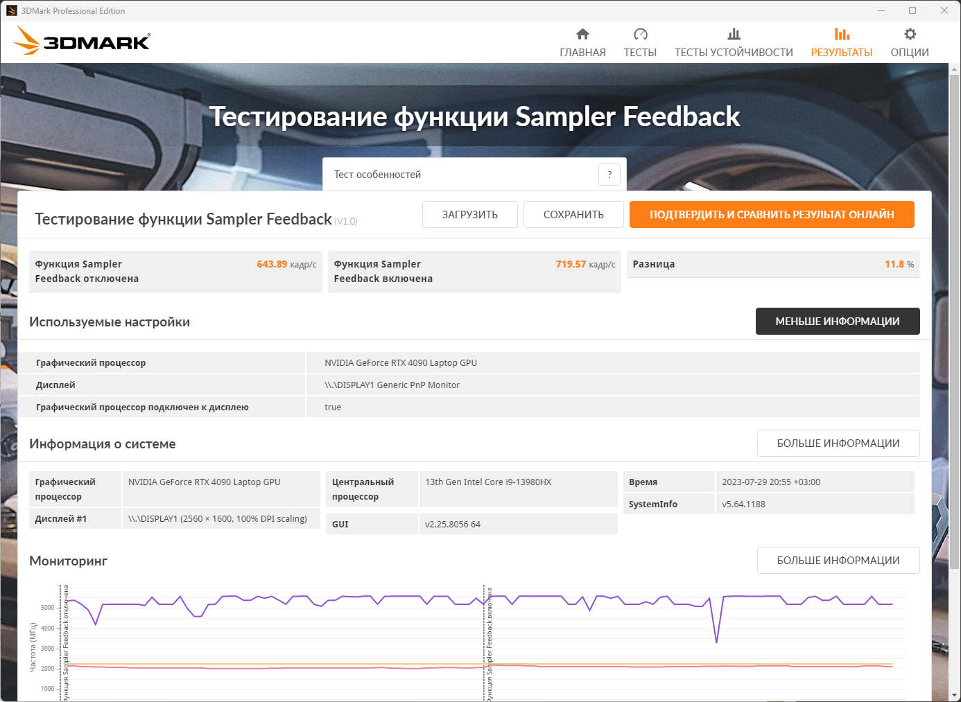 Специальный тест процессора из пакета 3Dmark считает, что в однопотоке новый процессор на 73% быстрее, а в мультипотоке – в 2,4 раза. DirectX Raytracing feature test говорит, что в «лучах» новая видеокарта в 2,4 раза быстрее. Тест Mesh Shader показывает разницу в 2,6 раз. Тест Sampler Feedback дает 176% разницы.