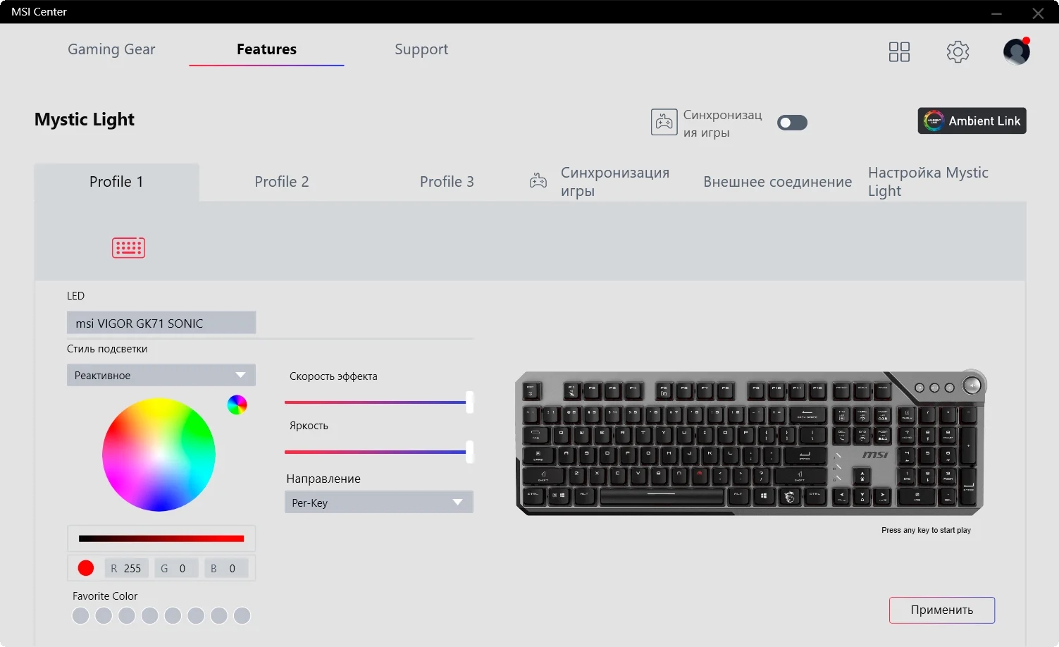 Для настройки и установки профилей клавиатуры GK71 можно использовать приложение MSI Center. Можно назначить три профиля, а также несколько эффектов подсветки. Однако большинство световых эффектов можно вызвать с помощью клавиши Fn (дракон). Однако для других эффектов освещения, таких как Game Sync и Ambient Link, требуется приложение MSI Center.