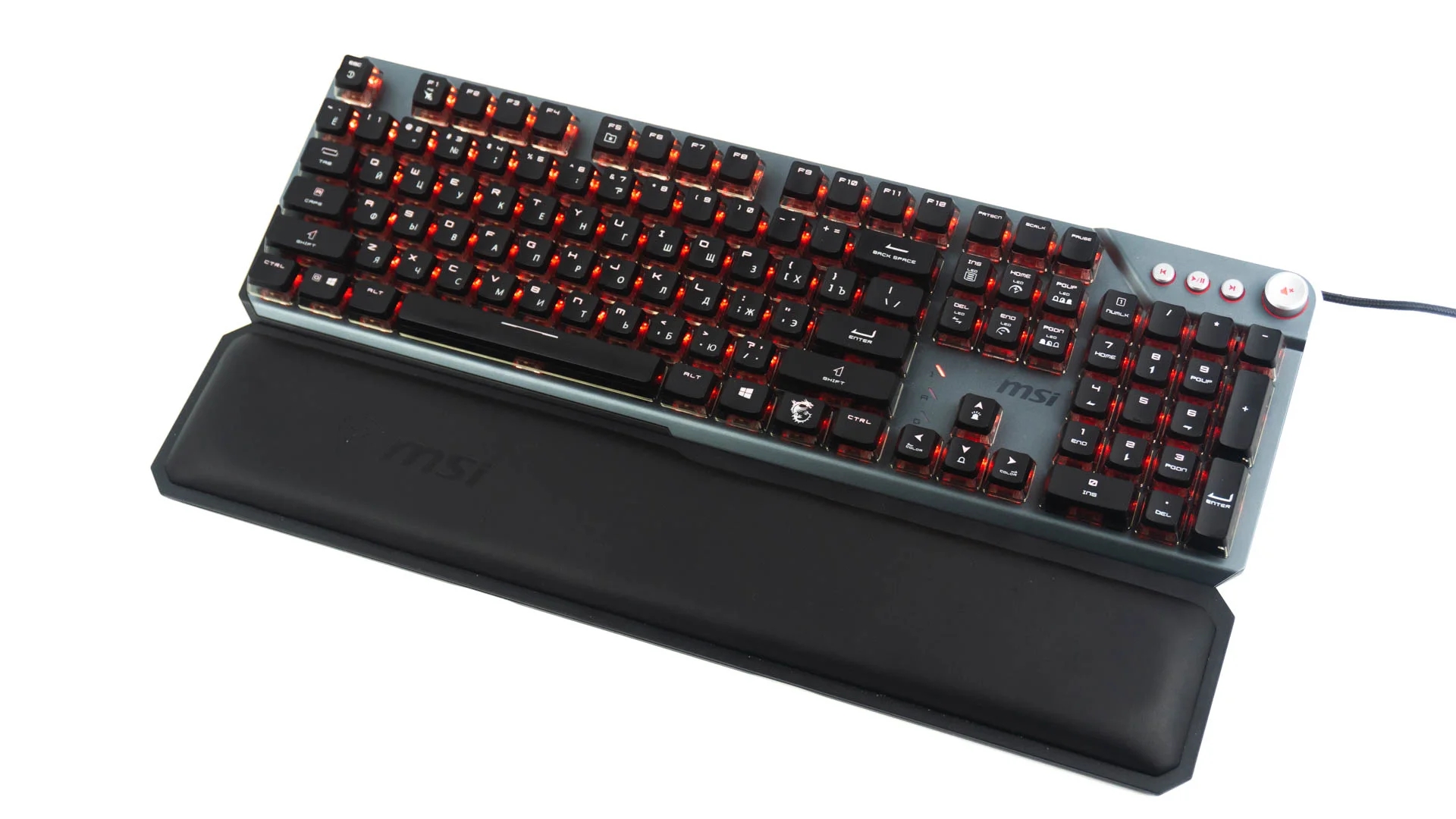 В комплект поставки входит клавиатура, съемник крышек, подставка для запястий из пеноматериала с памятью и материалы для чтения. Как и в большинстве представленных на рынке механических игровых клавиатур с подставкой для запястий, я уверен, что MSI использует искусственную кожу. И, как показывает мой опыт, она начинает трескаться и отслаиваться уже через несколько месяцев использования. Подушечка под запястья с пеной с памятью - отличное дополнение, но не стоит ожидать, что она прослужит долго.