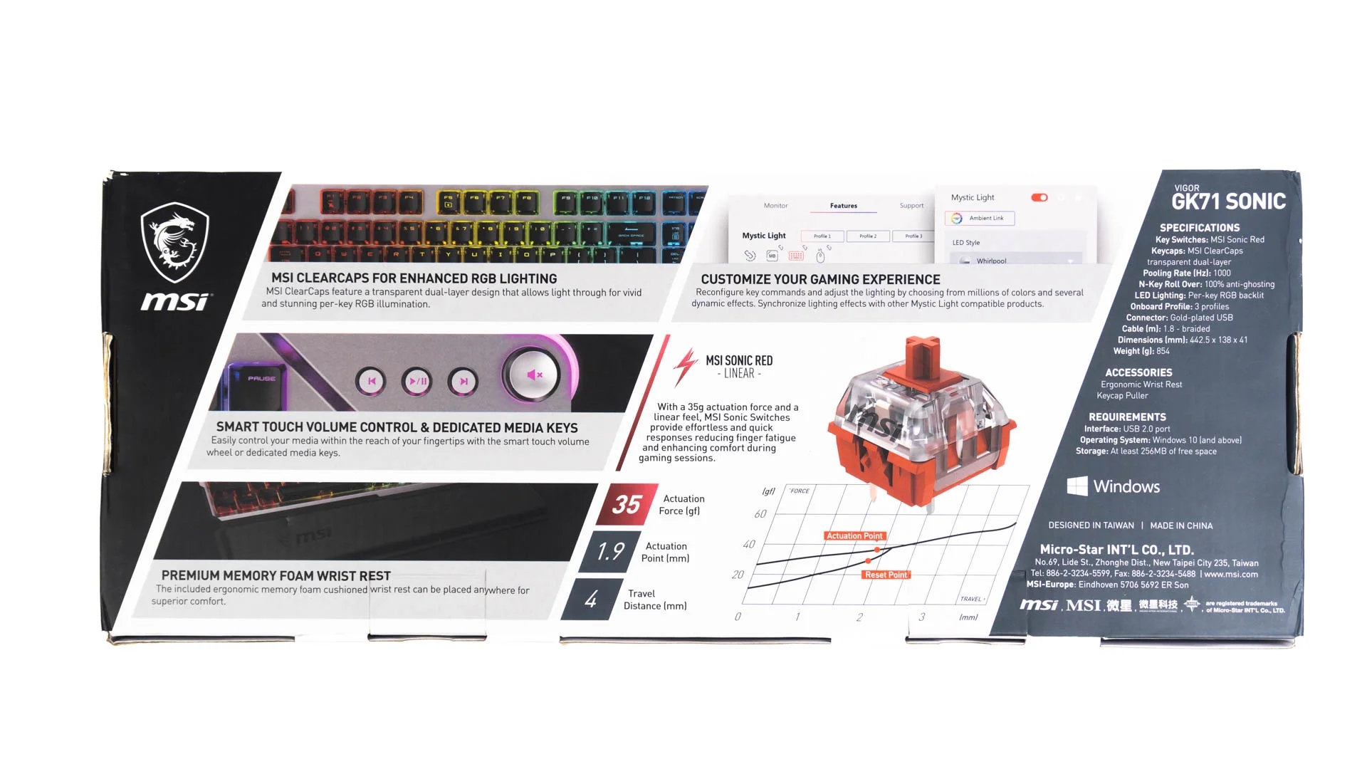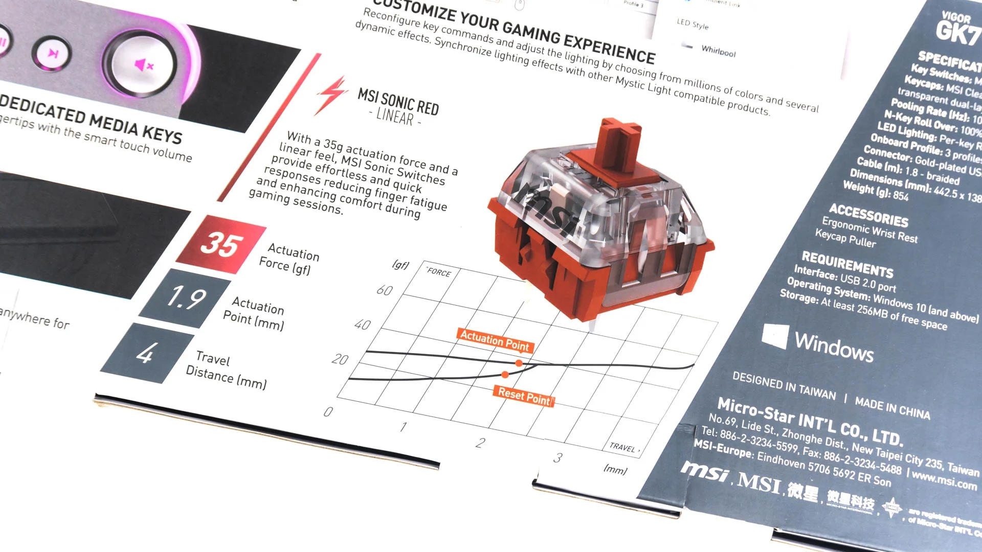 Переключатели MSI "Sonic" - это ребрендированные переключатели Kailh. Глядя на характеристики ванильных или оригинальных переключателей Kailh Red, я думаю, что MSI модифицировала или изменила эти переключатели. Например, согласно сайту Kailh, усилие срабатывания синих и красных переключателей составляет 50 г. Между тем, переключатели Sonic от MSI имеют меньшее усилие срабатывания, особенно Sonic Red.