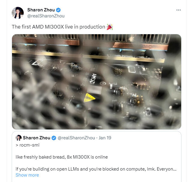 AMD Instinct MI300X был выпущен в то время, когда процессоры NVIDIA AI находятся в дефиците. LaminiAI стала одним из первых получивших ускорители MI300X и сообщила об их функционировании в социальных сетях. Поставки MI300X, по слухам, уже начались, и некоторые источники сообщают о получении MI300X цепочками поставок на Тайване.