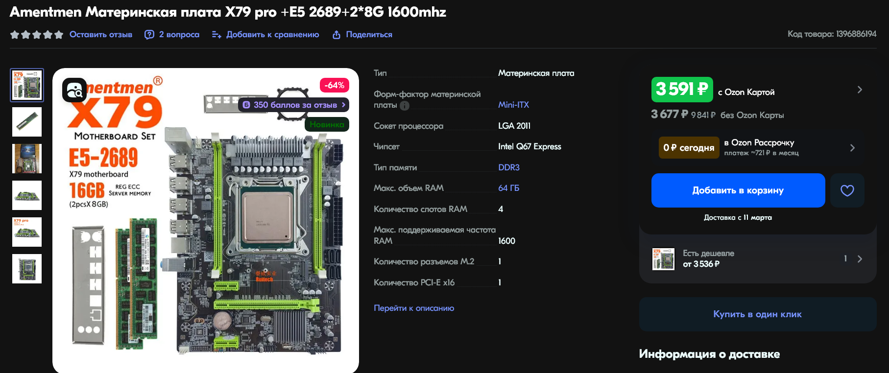 Так в каком же магазине мы сможем вобрать компьютер, удовлетворяющий таким жестким требованиям? Многие сейчас подумаю об популярном магазине AliExpress, и будут неправы. Сейчас там очень скудный ассортимент и высокие цены. Больший ассортимент и низкие цены на компьютерные комплектующие предлагает ОЗОН. Благодаря широкой сети пунктов выдачи заказать указанные комплектующие можно в любом уголке России. Чтобы вы смогли найти эти товары я укажу их артикулы. Итак начнем по порядку.