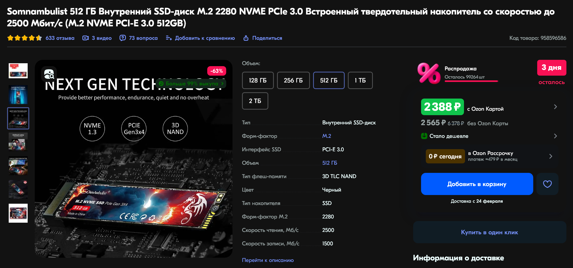 Накопитель Somnambulist 512 ГБ SSD M.2 2280 NVME PCIe 3.0. Имеет огромное количество положительных отзывов. Цена всего лишь 2388. Артикул на ОЗОНе - 958596586.