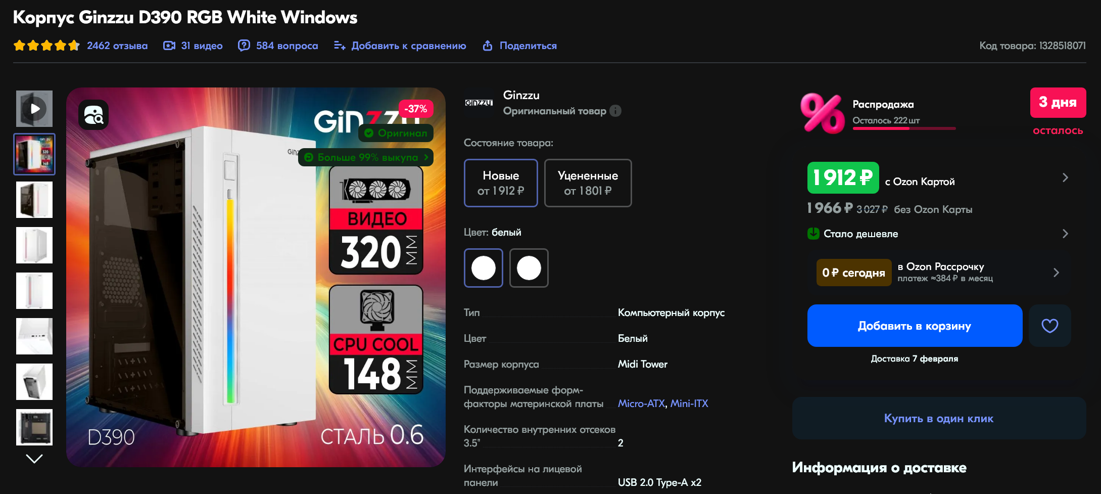 Корпус выбреем в белом цвете с прозрачным окном, через которое владелец ПК сможет наблюдать за своей белой видеокартой и цветастым кулером. Это Ginzzu D390 RGB White. Корпус формата Midi Tower. Имеет габаритные размеры 170х355х360 мм. Корпус поддерживает видеокарты длиной до 320 мм, чего нам хватит с головой. Спереди расположена светодиодная полоска для красочной подсветки. Цена корпуса всего 1912 рублей, что совсем дешево за такую красоту. Артикул на ОЗОНе - 1328518071.
